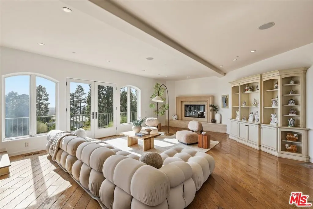 A true sanctuary of elegance and privacy, this extraordinary estate sits atop a ridge in exclusive Beverly Hills on nearly 34,000 sq. ft. of prime land, offering commanding, unobstructed views of the city below and beyond to Santa Monica and across the bay to Palos Verdes. A gated entrance and private driveway lead you to a spacious motor court and a three-car garage, setting the tone for the exclusivity within. Step inside, where timeless charm meets modern sophistication. The foyer welcomes you into an open living space bathed in natural light, with French doors framing the dazzling cityscape beyond. The living room, adorned with a fireplace, seamlessly connects to a gracious dining area, perfect for hosting unforgettable evenings. The chef's kitchen is a masterpiece of design and functionality, boasting a center island, top-of-the-line professional appliances, and a cozy breakfast nook with its own fireplace. Every culinary moment here is elevated by the serene ambiance. Descend to the lower level, where luxury knows no bounds. An inviting bedroom suite plus an additional room with custom built-ins provide both comfort and utility, but the true highlight is the magnificent primary suite. This retreat features a fireplace, dual spa-like baths, a walk-in closet, and French doors that open to the sparkling lap pool and spa; your private oasis. The top floor is an entertainer's dream, offering a relaxing family room with a fireplace, a grand built-in bar, and a deck that showcases breathtaking, glittering views of the evening's city lights. Whether hosting soires or enjoying quiet moments, this space is simply unparalleled. As if that weren't enough, a detached, nearly 500sf guest house perched above the garage provides ultimate flexibility and privacy. Complete with a private entrance, kitchenette, and bathroom, it's a perfect haven for guests or staff. Nestled above the hustle and bustle of the globally renowned city of Beverly Hills and enveloped in tranquility, this estate offers the best of both worlds: serene living and the vibrant allure of city life below. This is more than a home, it's a lifestyle of distinction.