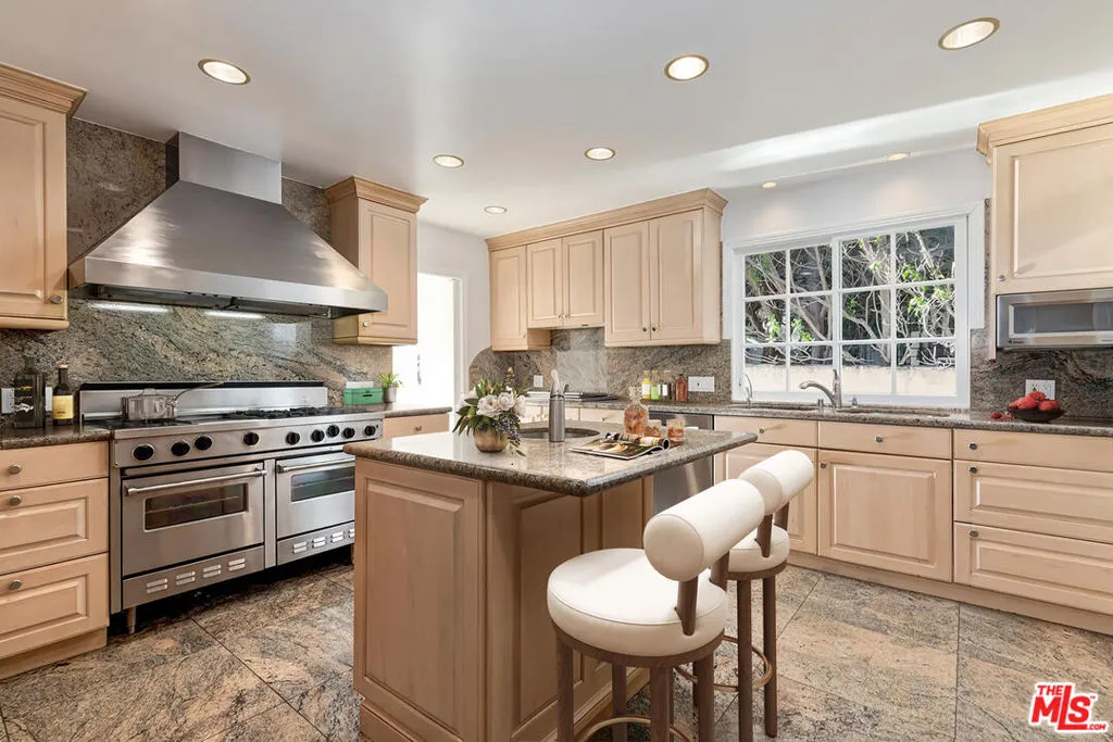 This elegant, updated, and spacious 2sty Mediterranean is available for sale for the first time in 28 years. Featuring light-filled rooms with high ceilings, French doors, and wood/marble floors, this gem has a fantastic layout with an open entertaining flow between the living room, the den/bar room, and the large beamed ceiling family room. A gracious entry with a sweeping staircase and chic powder room sets the tone. Fabulous chef's center-isle kitchen with top stainless appliances is accessed from a lovely formal dining room and charming breakfast room. 4 generous bedrooms upstairs (including 2 possible primaries) and maid's quarters downstairs. The main primary suite contains a sitting area, huge walk-in closet, and a luxurious updated bathroom. The alternate primary suite exhibits original purple Deco-era wall tilework in the glamorous bathroom. With a lot depth of 165ft, the rear yard is immense in scale and displays lawns, patios, pool, pool bath, storage room, garage with secondary laundry facilities, and mature foliage. Circular drive along with a straight connected gated driveway and garage affords tremendous off-street parking. Ultimate curb appeal on a beautiful Jacaranda tree-lined road moments from the best of Beverly Hills (including our renowned weekly Farmers' Market) and the Westside. Sold in strictly "as is, where is" condition. Seller selects services.