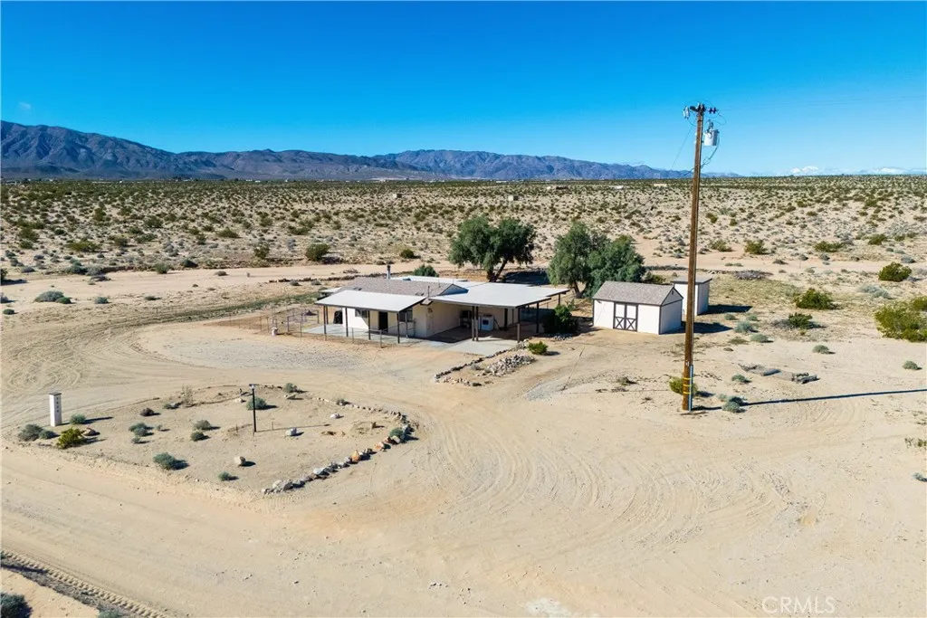 Escape to wide-open space and breathtaking desert beauty with this charming 2-bedroom, 1-bath home offering 1,076 square feet of comfortable living space on 5 expansive acres. Surrounded by endless 360-degree views, this property captures the true essence of high desert living. Located less than 15 miles from the rapidly growing Twentynine Palms area and the world-renowned Joshua Tree National Park, you’ll enjoy peaceful seclusion without sacrificing convenience. Whether you're looking for a full-time residence, weekend getaway, or investment opportunity, this property offers incredible potential. Recent improvements add both value and peace of mind, including a newer roof, private well for water, and a new pump house. A powered shed provides additional space for storage, hobbies, or a workshop setup—perfect for embracing the desert lifestyle.