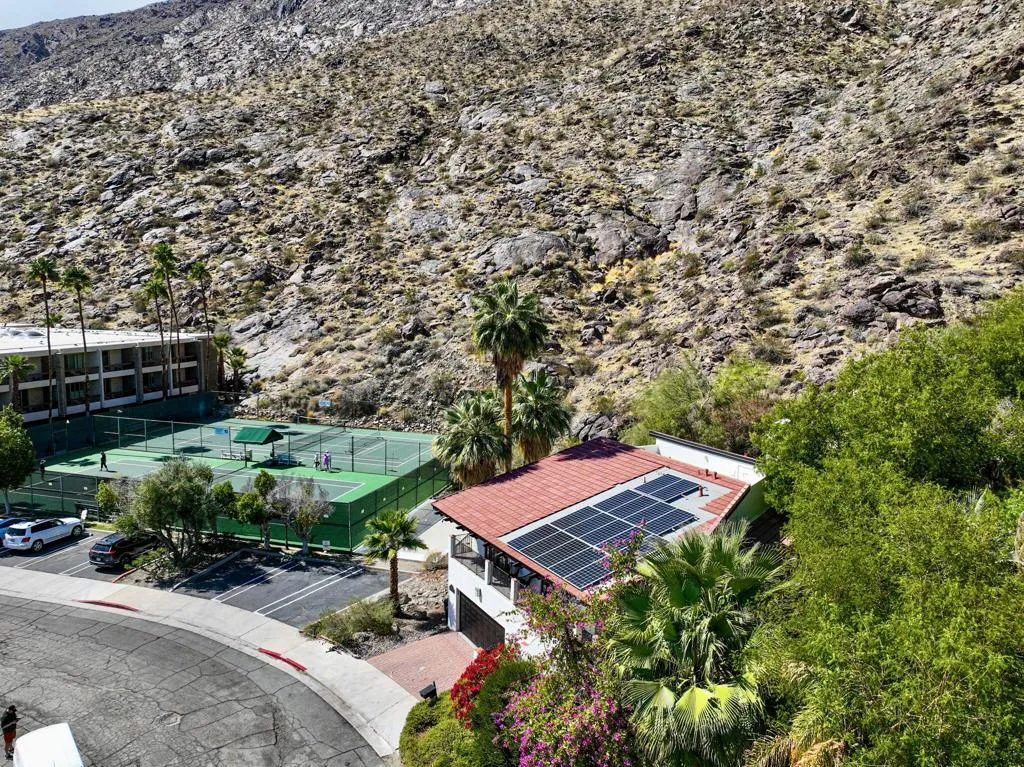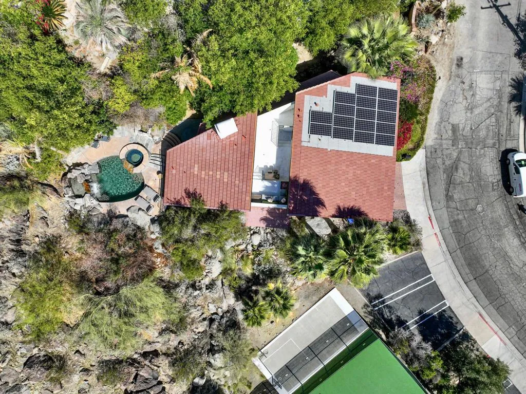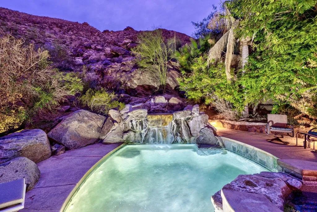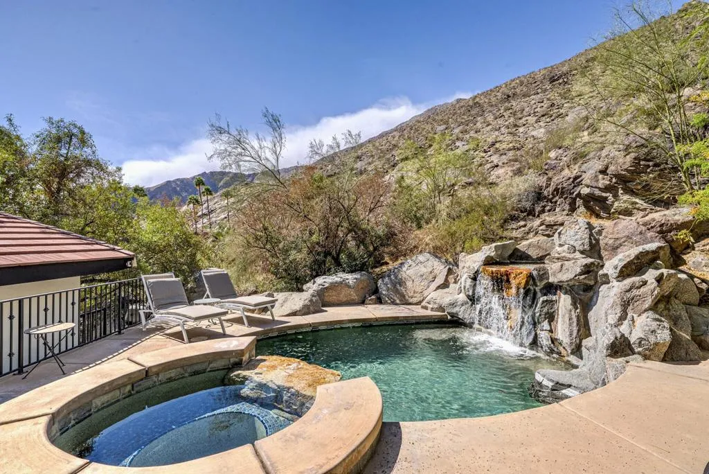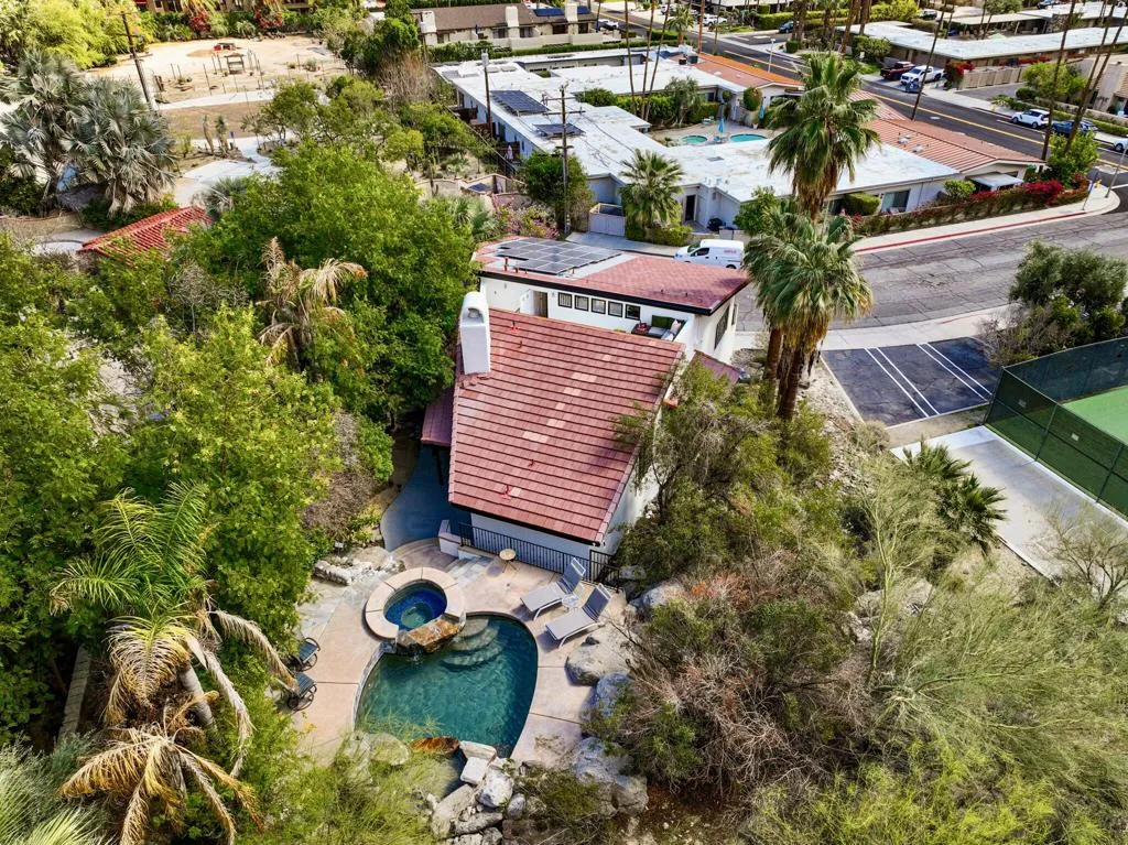 Set within one of the most coveted enclaves of the Historic Tennis Club neighborhood, just moments from the ultra-exclusive The 29 Colony, this hillside retreat captures the essence of timeless Palm Springs living. Framed by the dramatic San Jacinto Mountains, the setting is both serene and iconic--an address that rarely becomes available.Carved into the natural rockscape, the grotto-style pool and spa create a private resort atmosphere unlike anything else in the area. Panoramic mountain views, sculpted outdoor living spaces, and lush landscaping enhance the Mediterranean-modern architecture, offering an extraordinary backdrop for both quiet escapes and unforgettable entertaining.Currently configured as 3 bedrooms and 3 baths, the flexible floor plan was originally designed as two bedrooms on the main level with additional rooms below, allowing for easy reconfiguration to suit your vision. The primary suite features a fireplace and ensuite bath, while soaring vaulted ceilings, exposed wood beams, clerestory windows, and French doors flood the open living spaces with natural light.Hardwood floors, multiple porches, and a discreet rooftop deck invite sunset lounging above the city lights. A two-car garage with generous bonus space offers potential expansion. No HOA. Owned solar. A rare opportunity in an irreplaceable location.