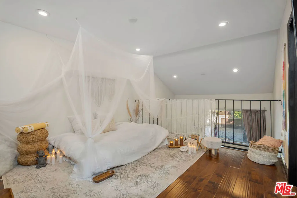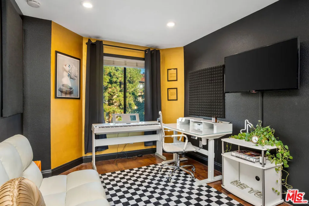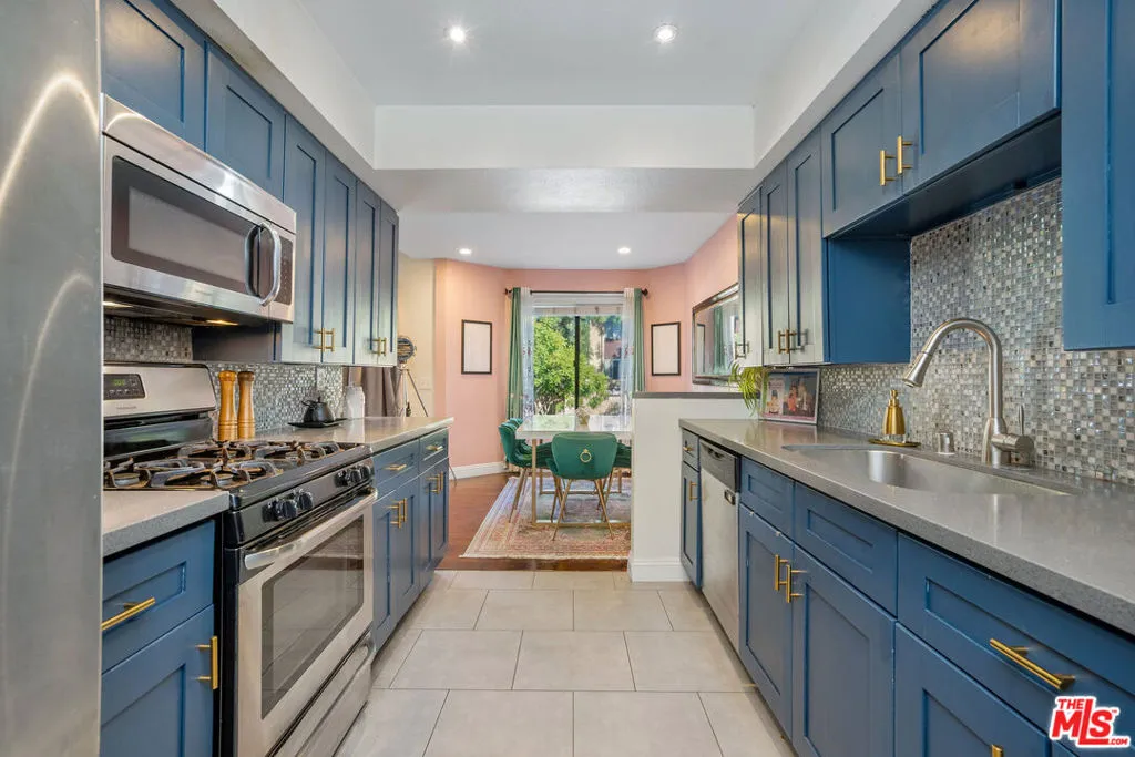 Welcome to your stylish Glendale escape! This light-filled, three-story luxe condo has all the charm, personality, and comfort you've been hunting for. The moment you walk in, you're greeted by soaring ceilings, a modern fireplace, a cute wet bar, and an open living space that just feels good. The balcony overlook adds a little architectural drama and makes the room feel even bigger. The kitchen is a total standout with its deep blue cabinetry, stone counters, mosaic backsplash, stainless steel appliances, and plenty of storage. It flows right into a sunny dining area framed by leafy views -- the perfect spot for morning coffee or cozy dinners. The primary suite is its own little retreat with two custom closets, a spacious bathroom with a soaking tub with jets and tiled shower, dual sinks, and a private patio. There's even an attached office, which is a huge plus for WFH days. The second bedroom has its own vibe, currently set up as an eclectic creative studio with a big closet, dressing area, and bathroom. Upstairs, the loft adds bonus flex space for a den, gym, guest area, or whatever your lifestyle calls for. You also get in-unit laundry and tons of storage throughout. The community offers a pool, sauna, and recreation room, and gas is included in the HOA. And the location? So good. You're just a few-minute stroll to Whole Foods, Trader Joes, Glendale Fashion Center (World Market, Nordstrom Rack, and more), a quick drive to the newly anticipated Erewhon currently being built, and just 1 mile from The Americana and Glendale Galleria. It is the perfect mix of cozy comfort, modern style, and Glendale convenience all wrapped into one easy-to-love home.