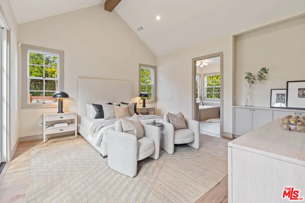 Welcome to this stunning one level new construction on a double cul-de-sac in Valley Village. A HUGE front door greets you past the Doorbird assisted gated entryway. The home has a traditional layout with a center hall that unveils each room as you pass. First off is the "Great Room" with 15 foot ceilings, wood beams, double sliding French Doors that open to a large entertainers yard, a stunning marble fireplace framed with bookshelves and storage. Across the hall you'll find your guest powder room with custom "Taj Mahal" stone counters, Toto toilet and Newport Brass fixtures. Just past the powder is laundry and mud room. Now, off to the "Cooks Kitchen" with Thermador Appliances, Built-in French door fridge/freezer and drawer fridges in island, seating at the island for 4+ as well as a breakfast nook, coffee bar and a large walk in pantry. The dining room is adorned with custom paneling, moody paint choices, vaulted ceilings and access to the yard. Next, past the wall of custom storage cabinets are two ensuite bedrooms. Down the hall you'll find the Primary Suite with an office, Vaulted ceilings with wood beams, hardwood floors, French Doors to the yard and the most attractive bathroom with Crema Marble flooring, counters, and surround on the sunken tub with Newport Brass fixtures, an exceptionally large shower shows off the custom Calcutta Marble tile and beautiful brass surround. Now, lets make our way outside. This 15k+ lot has one neighbor to the South and the rest of the massive yard is framed by rear yards. Privacy Galore. There is large pool and spa that was rebuilt with new eqpt, tile and plaster. The gazebo and built in BBQ overlook the wrap around yard that has multiple areas for a Sports Court or Pickleball, guest house or just running around. Enjoy the trees and the ancient Sycamore that the home was built around, truly special. A pleasure to view.