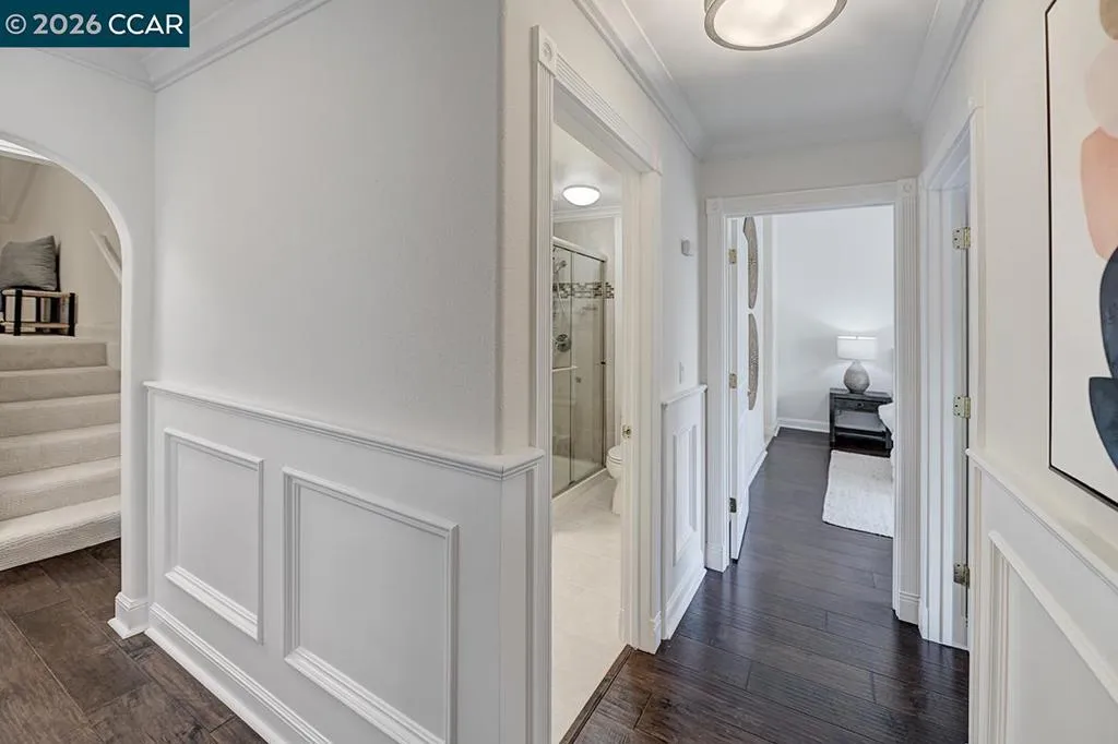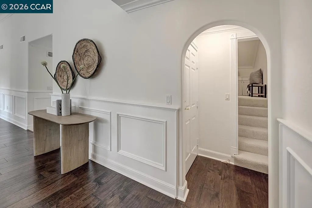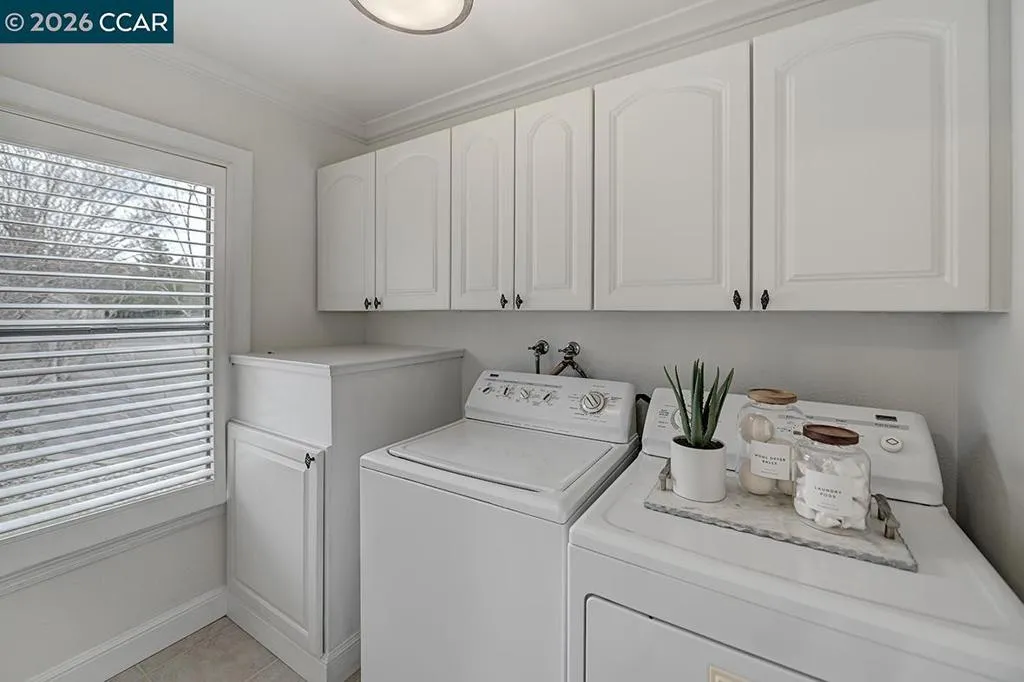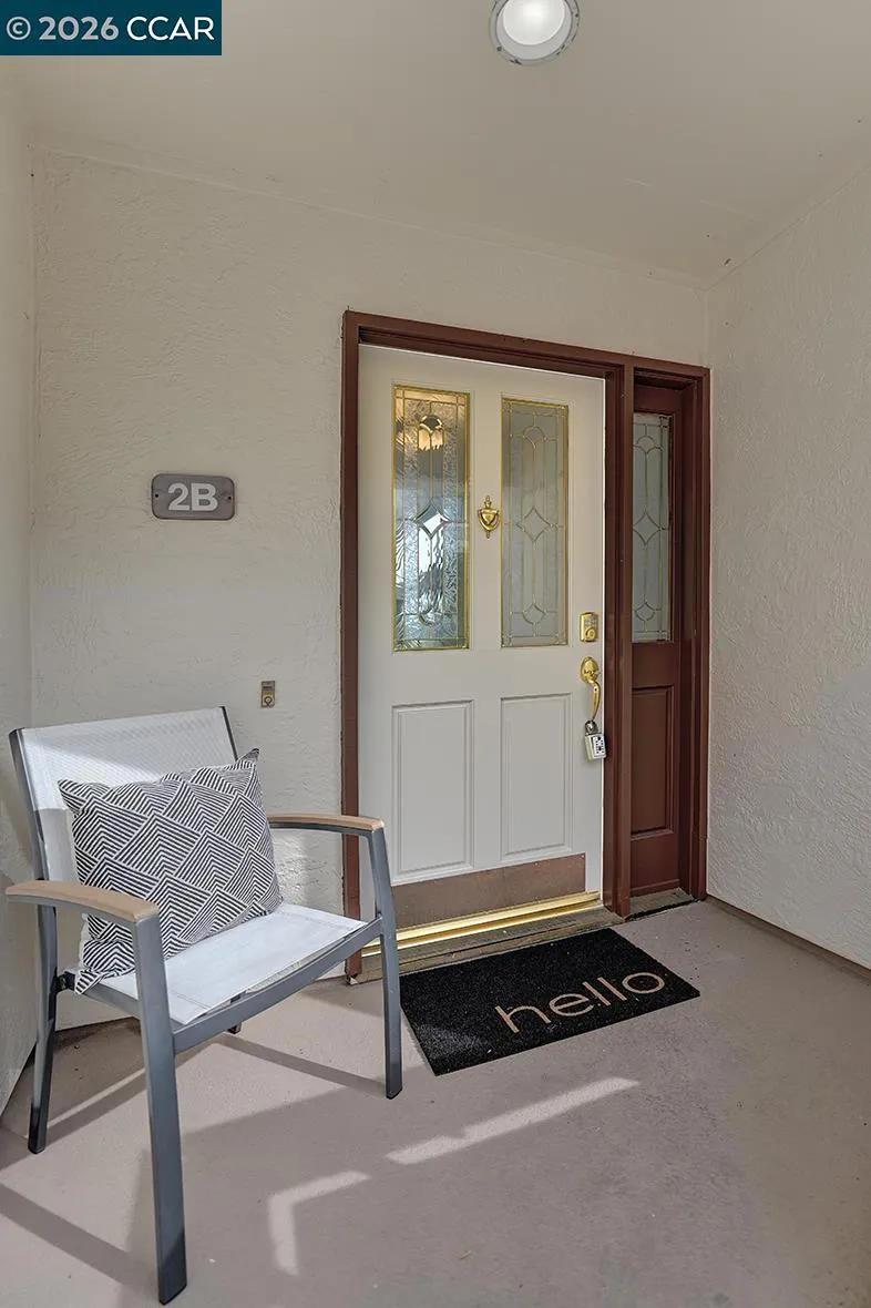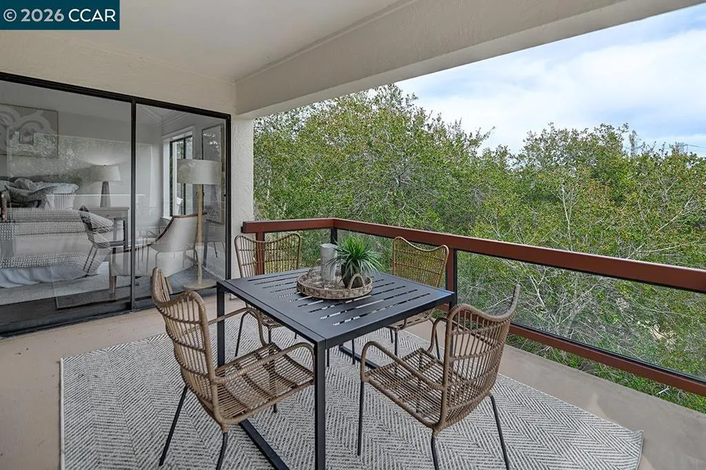 Tucked into a peaceful, tree-lined setting in Rossmoor, this sought-after Villa Verde model offers privacy, light, and style. Featuring 2 bedrooms, 2 baths, and a finished loft/den, the open floor plan is filled with natural light from oversized windows and tranquil hillside views. Enjoy seamless indoor-outdoor living on the expansive deck surrounded by mature trees—ideal for morning coffee, sunset wine, or entertaining guests. Designer touches include high ceilings, hardwood floors, new carpet, wainscoting, crown molding, and updated lighting and fixtures throughout. The eat-in kitchen features white cabinetry, granite countertops, a stainless refrigerator, white appliances, and plantation shutters framing serene views. The living room offers an electric fireplace and mounted flat-screen TV, creating a warm, inviting space to gather. The primary suite includes a walk-in closet and ensuite bath with soaking tub and double-sink vanity. The guest bedroom opens directly to the deck, perfect for visitors. A finished loft w/built-in desk, serviced by central H/A is ideal for a home office or flex space. In-home laundry & attached painted garage w/ epoxy floor complete this move-in-ready retreat.