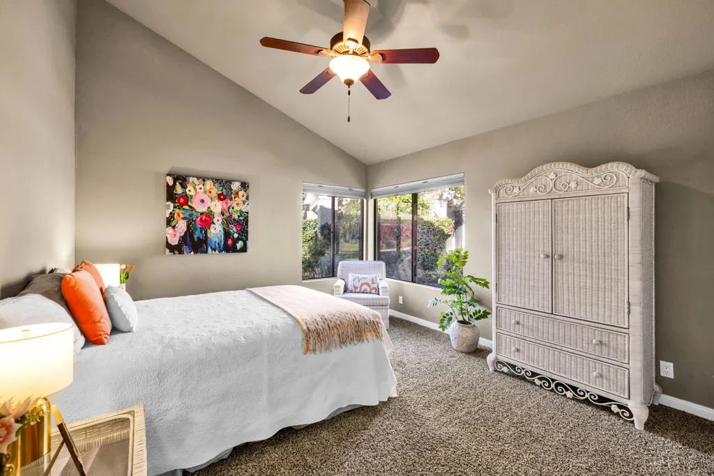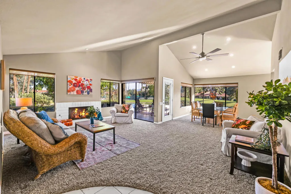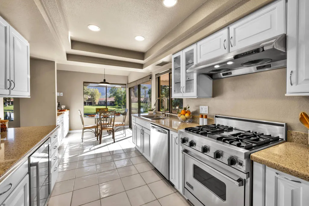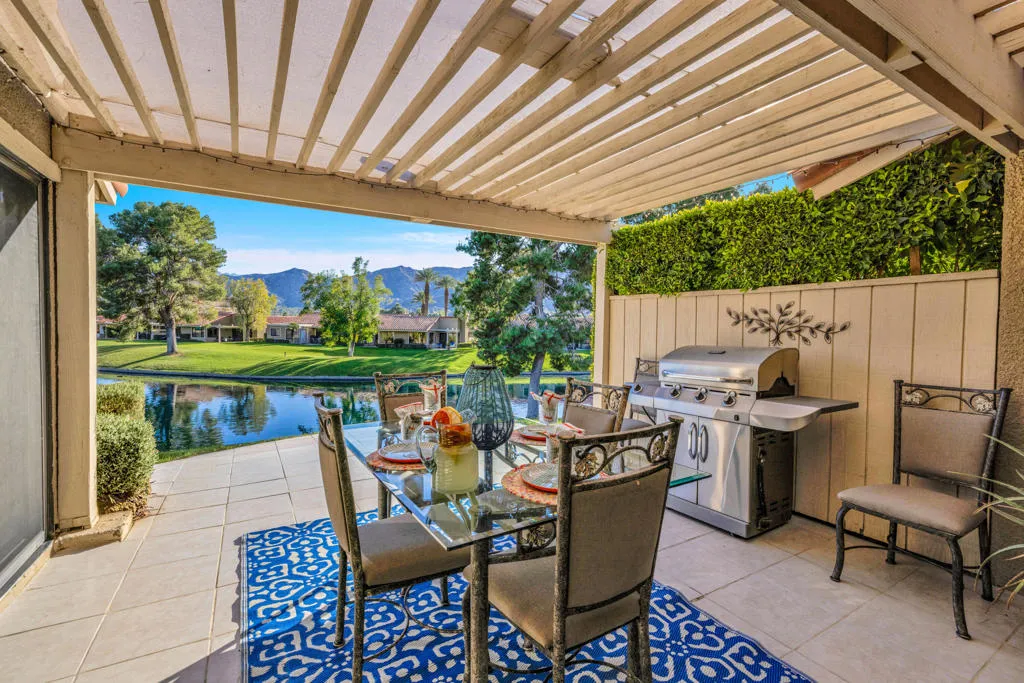 Arguably the best location in the community of Rancho Mirage Racquet Club, this 3-bedroom condo sits on a beautifully elevated lot with prized southern exposure, complemented by west-facing views adjacent to the kitchen. Elevated above the widest stretch of the lake, the home feels as though it sits directly on the water. Vaulted ceilings and walls of windows capture sweeping lake and mountain views from the kitchen, dining, living room and primary bedroom. The kitchen offers plenty of storage with an additional storage island, and features a commercial-grade Viking gas range, beverage refrigerator, and breakfast nook. Generously sized bedrooms offer comfort and privacy, while the sizeable wrap around patio- accessible from the living, dining, and kitchen areas- provide dedicated spaces for lounging, dining, and entertaining with expansive and unobstructed views.Recent upgrades include a hot water heater (Nov 2023) and HVAC system (2020). For those who value sun-filled outdoor living, breathtaking mountain and water views, and a quaint community on fee simple land, this home truly delivers.