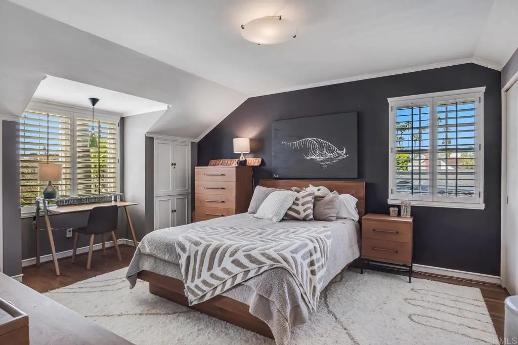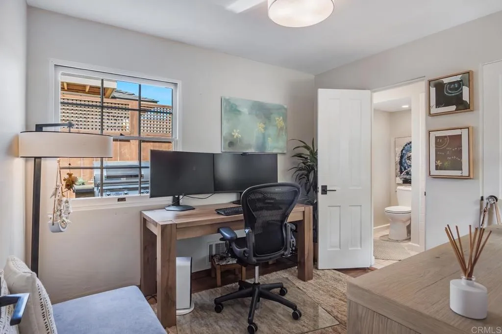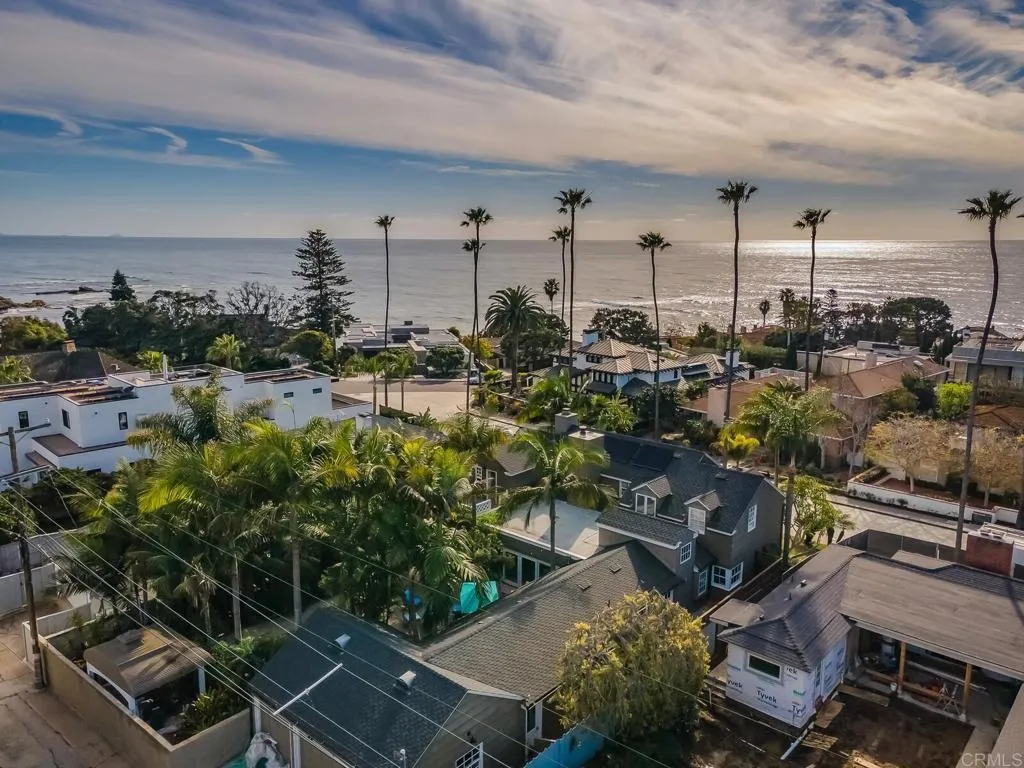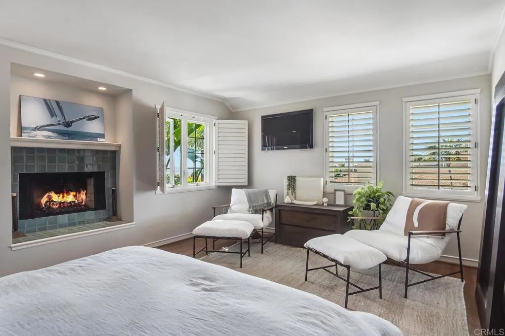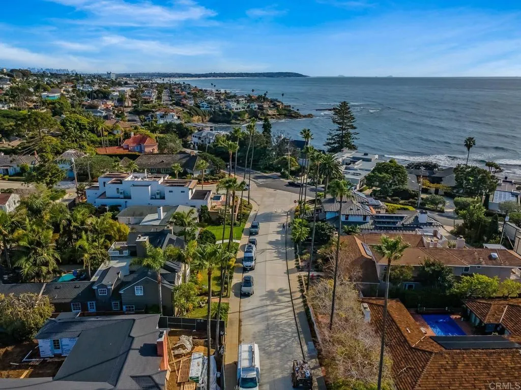 Located blocks from the beach in the highly desirable Lower Hermosa neighborhood of La Jolla, this beautifully upgraded 4BR/4BA home offers exceptional indoor-outdoor flow and a rare bonus four-car garage with convenient alley access. The custom gourmet kitchen is a true centerpiece, featuring vaulted ceilings with two dormer windows that flood the space with natural light. It is appointed with a Thermador range, Thermador dishwasher, wine refrigerator, and a custom appliance garage designed to house a microwave, coffee maker, toaster, and more. Quartz countertops with varied textures and tones add depth and visual interest. A charming Dutch door opens to a private side barbecue area, enhancing the home’s seamless indoor-outdoor lifestyle. The kitchen flows effortlessly into the family room and out to the lush tropical backyard, ideal for entertaining. The family room fireplace, highlighted by a raised and floating hearth, anchors the main-level living space with warmth and architectural character. Two ground-floor bedrooms provide flexibility for guests or multi-generational living, including one with an en suite bath. Upstairs, the spacious primary suite features its own fireplace and a peaceful ocean glimpse. The primary bathroom offers a jacuzzi tub, separate shower, and a private deck off the bath — creating a spa-like retreat. Recent improvements include a brand-new roof, owned solar system, and new furnace for efficiency and comfort. The bonus four-car garage offers built-in cabinetry and a sink, creating exceptional flexibility for a gym, studio, workshop, or creative retreat.