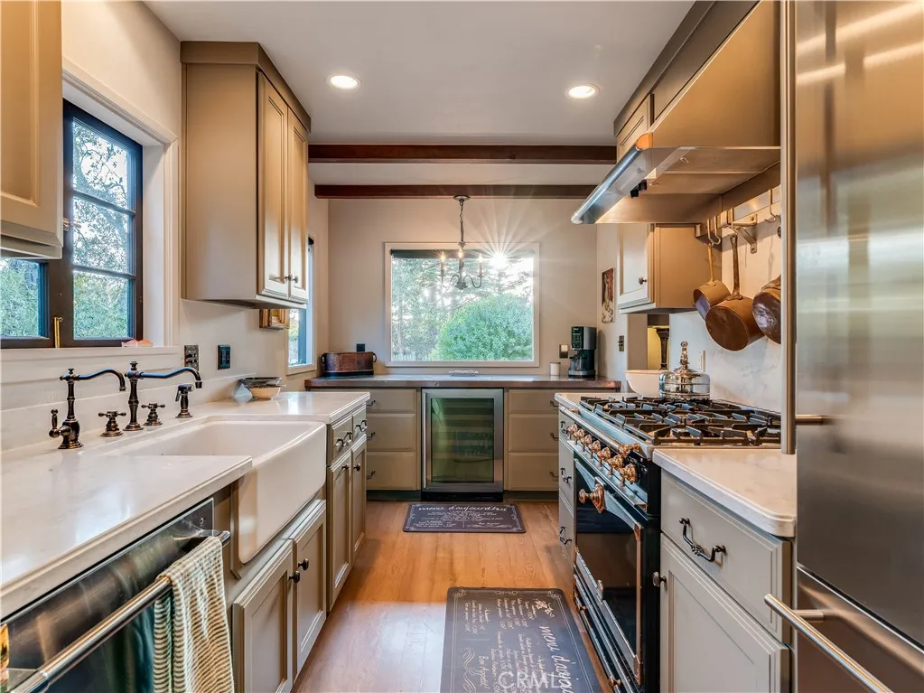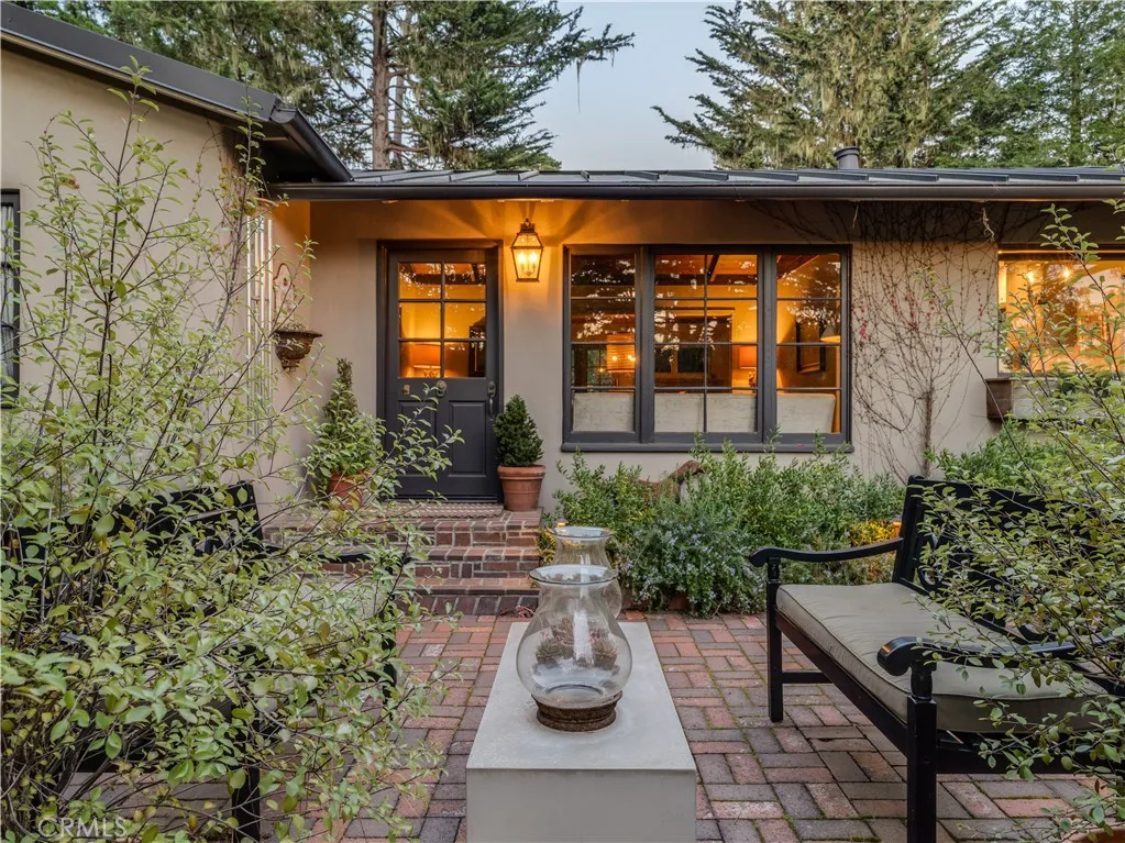 Tucked into a magical setting, this French-inspired retreat is a rare, fully reimagined property blending old-world charm with exceptional craftsmanship and modern amenities. Thoughtfully redesigned by Hall Pardoe Design, the home evokes French countryside romance while offering today’s comforts, all within a private, multi-lot sanctuary in Cambria. The main house and cottage have been comprehensively upgraded, beginning with essential structural and exterior improvements, including regraded drainage, new metal roofs, and re-stuccoed exteriors with integrated color for lasting beauty without repainting. Fresh interior and exterior paint throughout enhances every space, while new French doors in the dining room open to expansive IPE decks off the dining room, guest bedroom, and primary suite—ideal for morning coffee, sunset dining, and peaceful outdoor living. Inside, the home has been opened and refined with intention. The remodeled and extended kitchen, updated bathrooms, and newly opened wall between the living and dining rooms enhance light and flow. All drywall in both structures has been resurfaced and retextured; doors, woodwork, and floors have been stripped, bleached, custom-stained, and refinished for a cohesive, artisanal feel. Vaulted cedar ceilings crown the living room, library/TV room, primary suite, bath, and closets, with walk-in closets in both the guest and primary bedrooms. Finishing details include custom oil-rubbed Reggio floor registers and Rejuvenation push-button dimmers with antique bronze plates. Modern infrastructure discreetly supports the romance, including reworked electrical systems, a relocated exterior panel, new kitchen sub-panel, Navien tankless water heater, soft water system, and dedicated mechanical and internet hub. Additional upgrades include air conditioning and updated heating in the main house, gas heat in the cottage, reverse osmosis filtration, new washer and dryer, and gas lines to an exterior fire table and barbecue.
