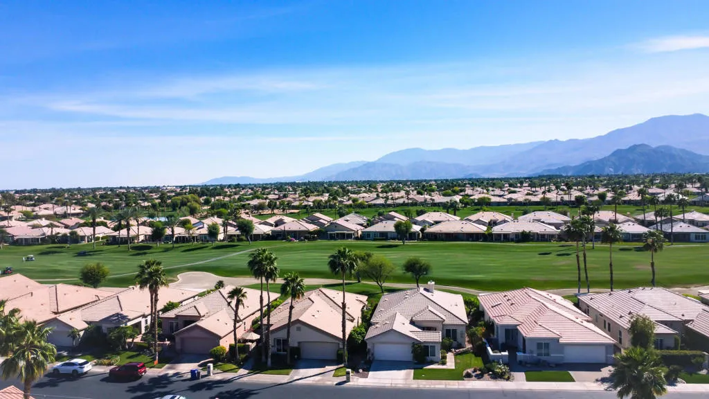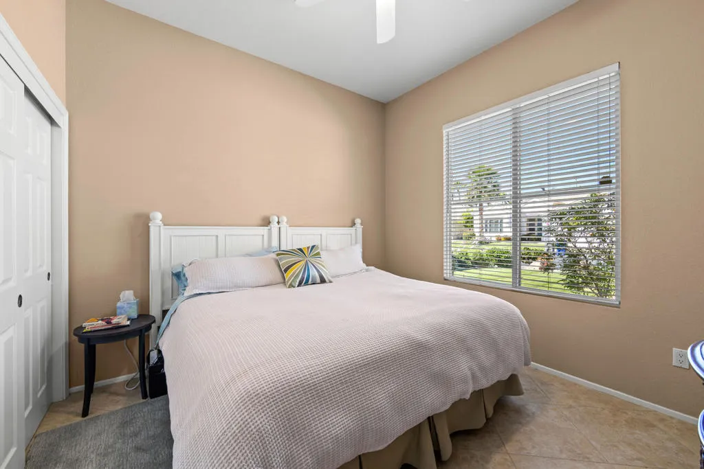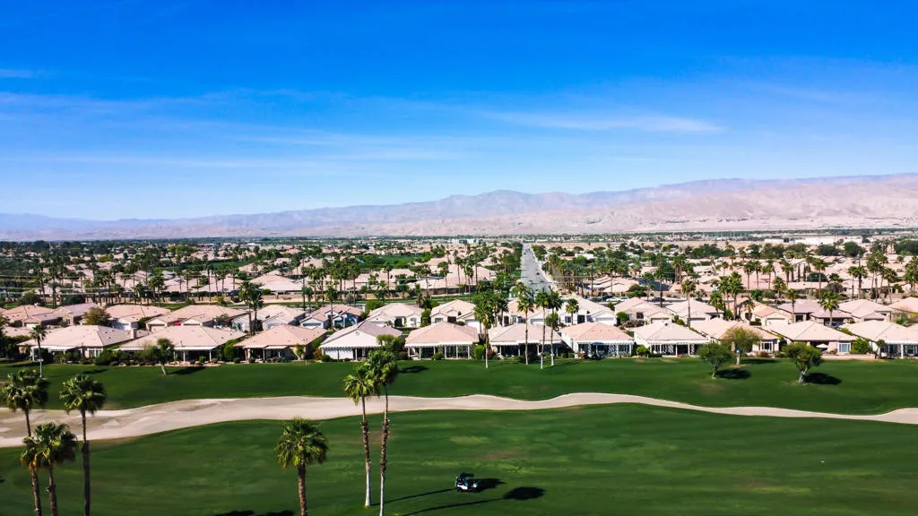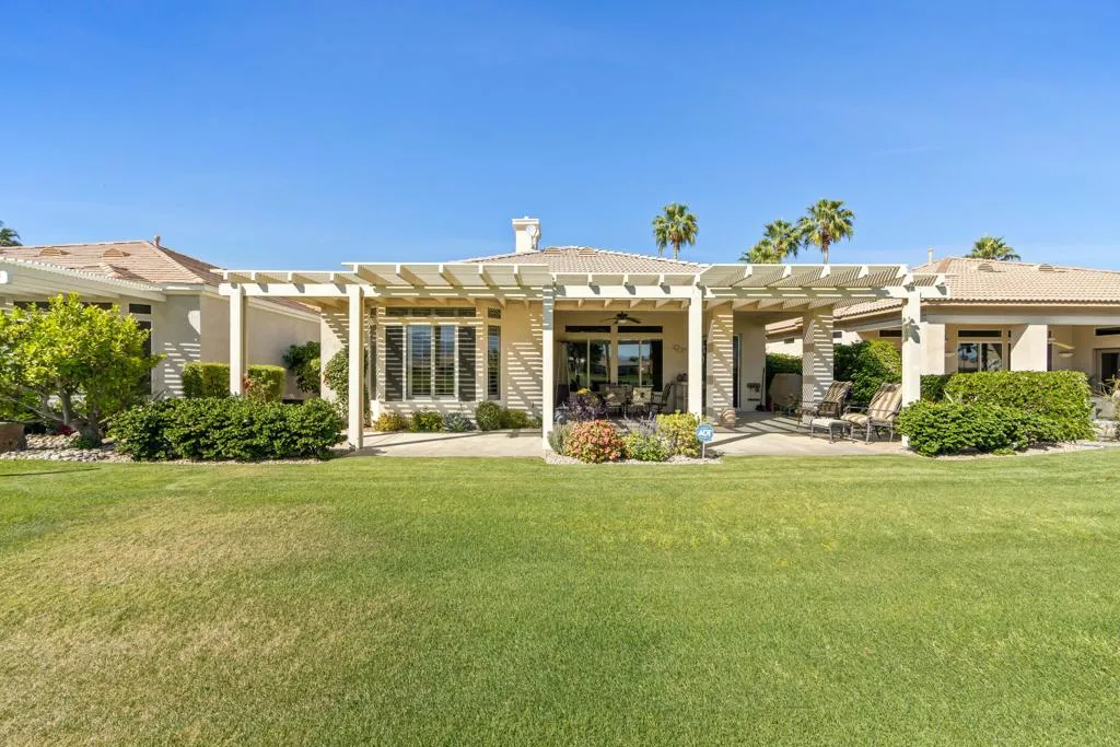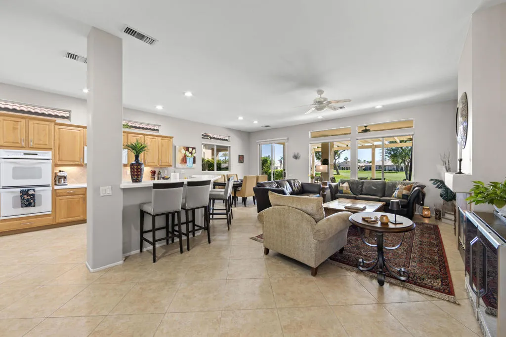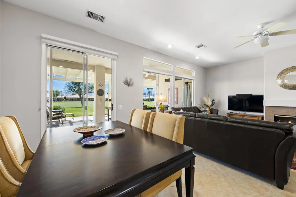 BIG PRICE REDUCTION!! Spectacular, south-facing golf course (10th hole) and Santa Rosa Mountain views from this beautifully maintained, Merion Plan home. An upgraded, glass insert door welcomes you into a great room floorplan. The entry way opens onto the living room with granite tile fireplace face (gas). Central living area overlooks the patio and fairway views. Efficient kitchen offers lots of counter space, gas cooktop, newer microwave, oversize pantry and lots of cabinets. Guests will enjoy the kitchen bar and added seating. Nicely sized, primary bedroom suite with huge walk-in closet w/ closet organizers. Guest bedroom located just down the hall. Both baths have been updated with newer counter tops, showers and low flow toilets. Den/office was extended to allow for built-in Murphy bed, great for over-flow guests. Inside laundry room with washer & dryer. Garage features extended space for golf cart and added built-in storage to include overhead storage space. Extended patio area is covered, plus, alumina-wood cover, overhead fan w/ light and a large gas barbecue. House has been pre-wired for security system.