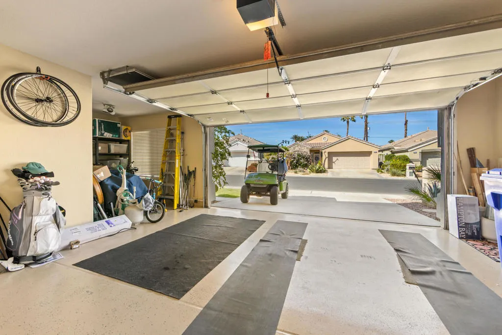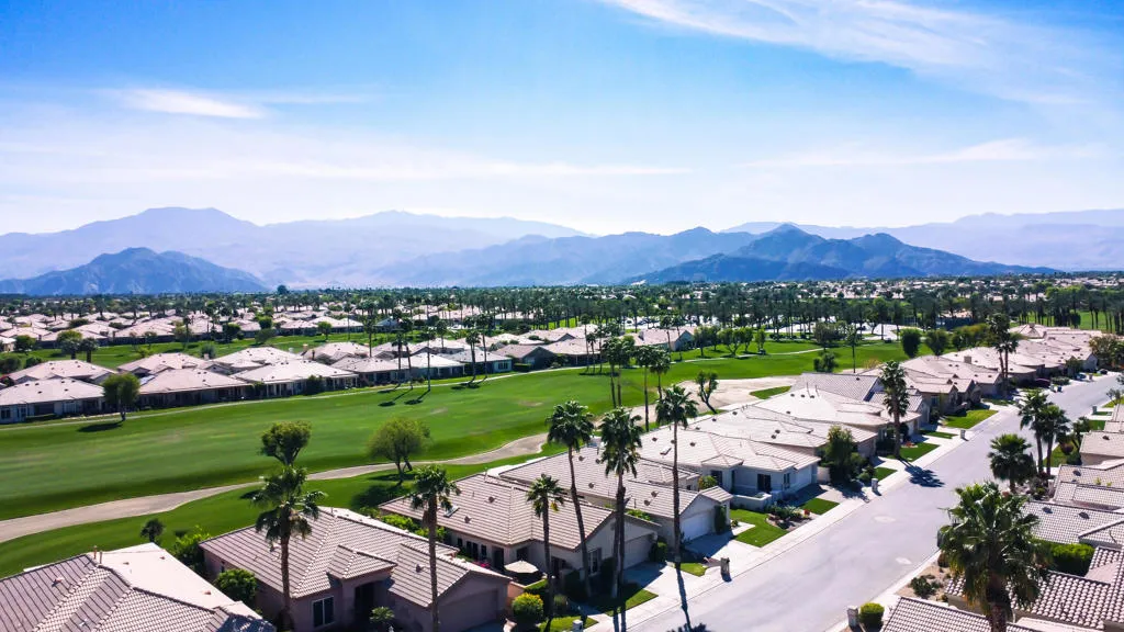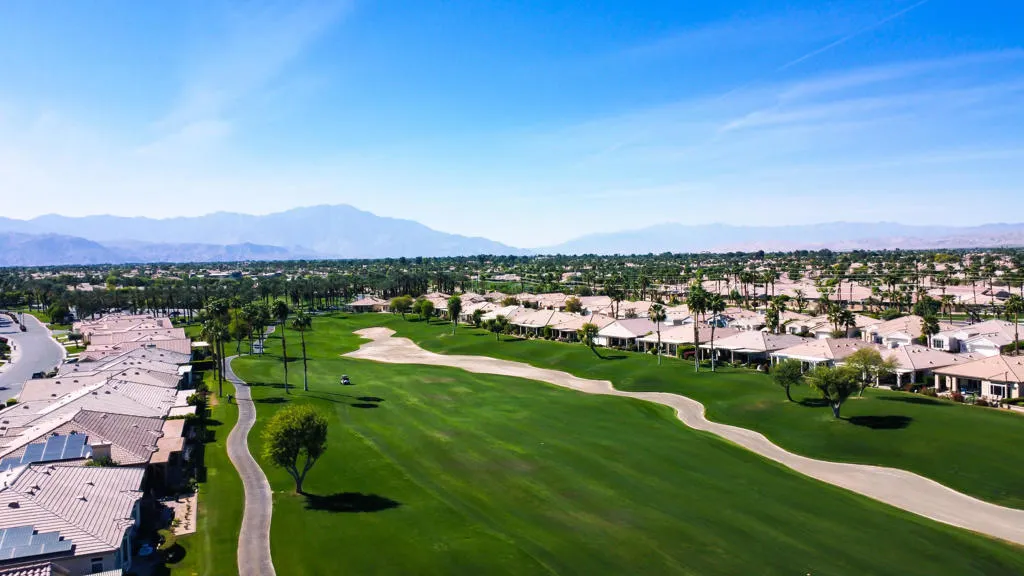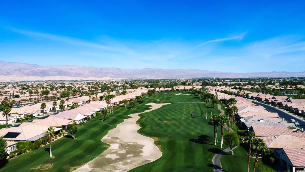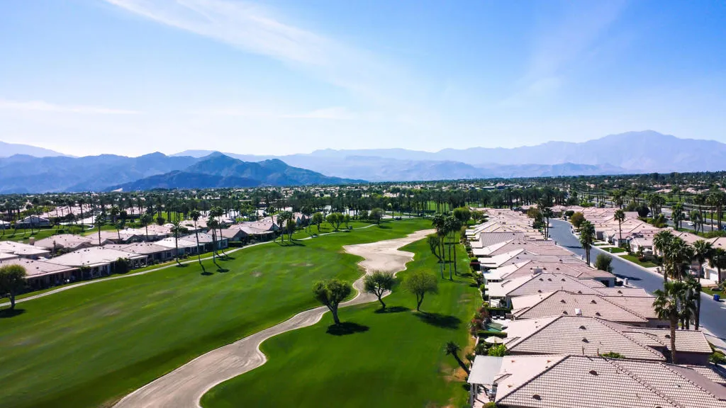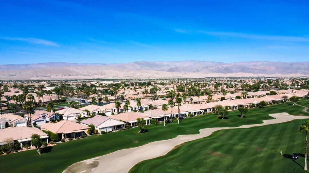 BIG PRICE REDUCTION!! Spectacular, south-facing golf course (10th hole) and Santa Rosa Mountain views from this beautifully maintained, Merion Plan home. An upgraded, glass insert door welcomes you into a great room floorplan. The entry way opens onto the living room with granite tile fireplace face (gas). Central living area overlooks the patio and fairway views. Efficient kitchen offers lots of counter space, gas cooktop, newer microwave, oversize pantry and lots of cabinets. Guests will enjoy the kitchen bar and added seating. Nicely sized, primary bedroom suite with huge walk-in closet w/ closet organizers. Guest bedroom located just down the hall. Both baths have been updated with newer counter tops, showers and low flow toilets. Den/office was extended to allow for built-in Murphy bed, great for over-flow guests. Inside laundry room with washer & dryer. Garage features extended space for golf cart and added built-in storage to include overhead storage space. Extended patio area is covered, plus, alumina-wood cover, overhead fan w/ light and a large gas barbecue. House has been pre-wired for security system.