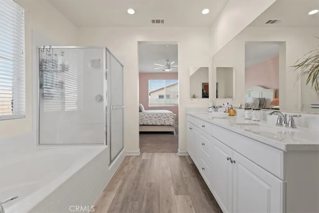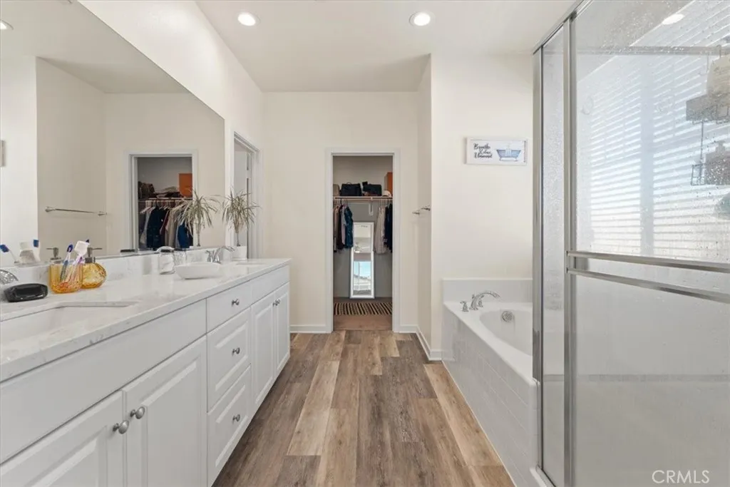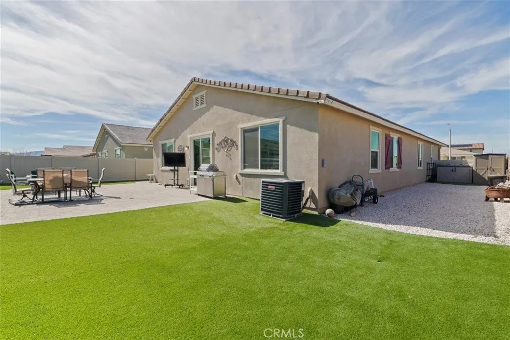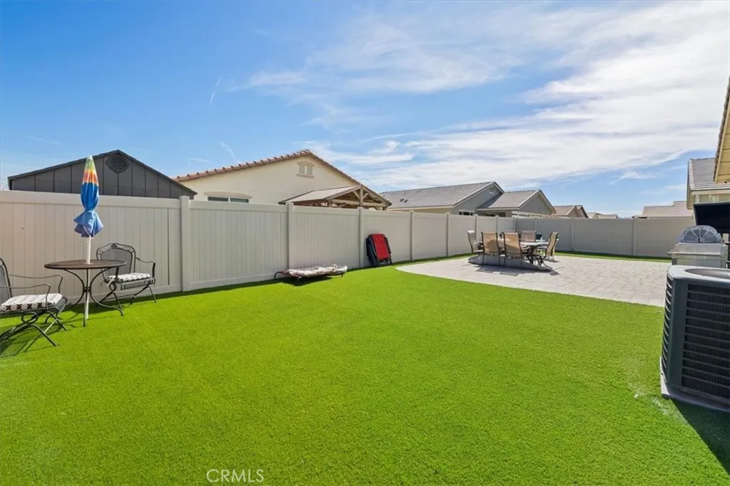 The primary suite serves as a relaxing retreat with a spa-style bathroom offering dual vanities, a soaking tub, a separate shower, and a generous walk-in closet. Outdoors, the backyard is designed for effortless enjoyment with high-end turf and contemporary pavers, creating a polished, low-maintenance setting for gatherings or quiet evenings at home.