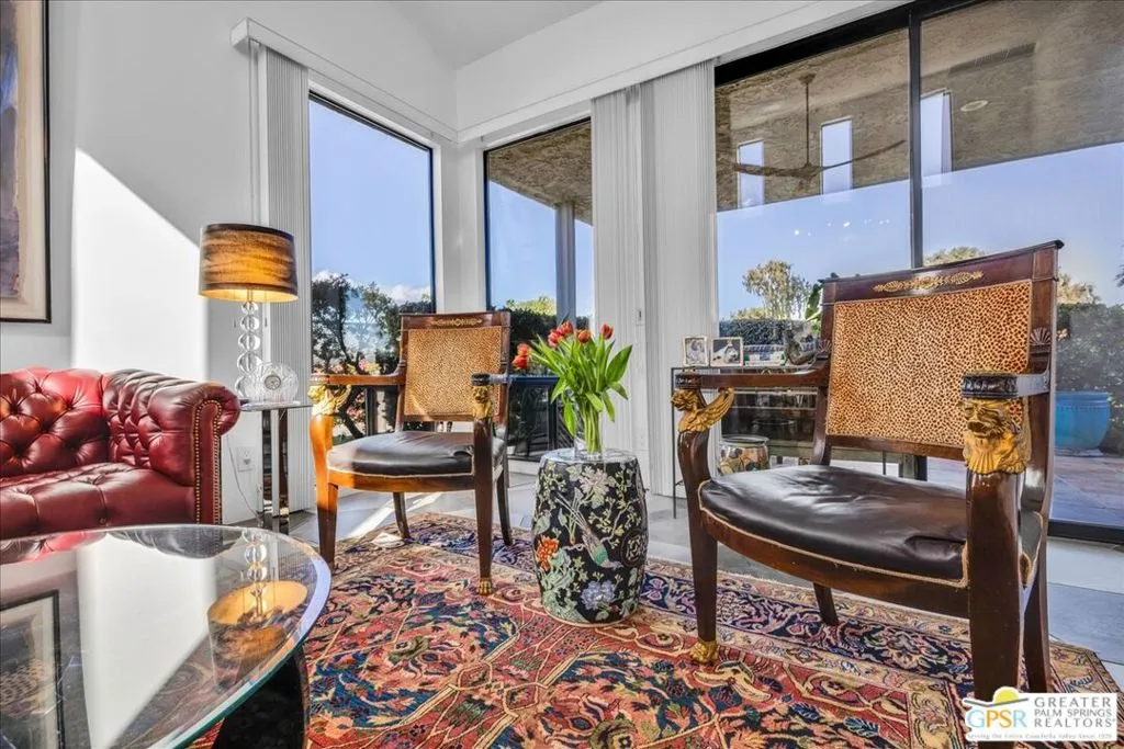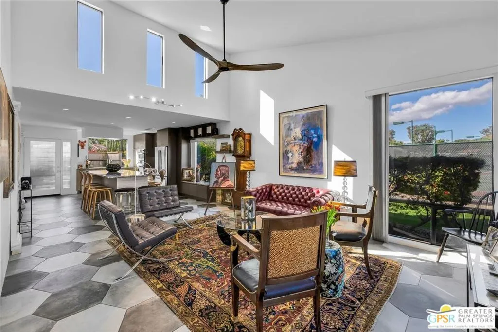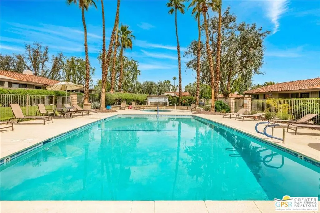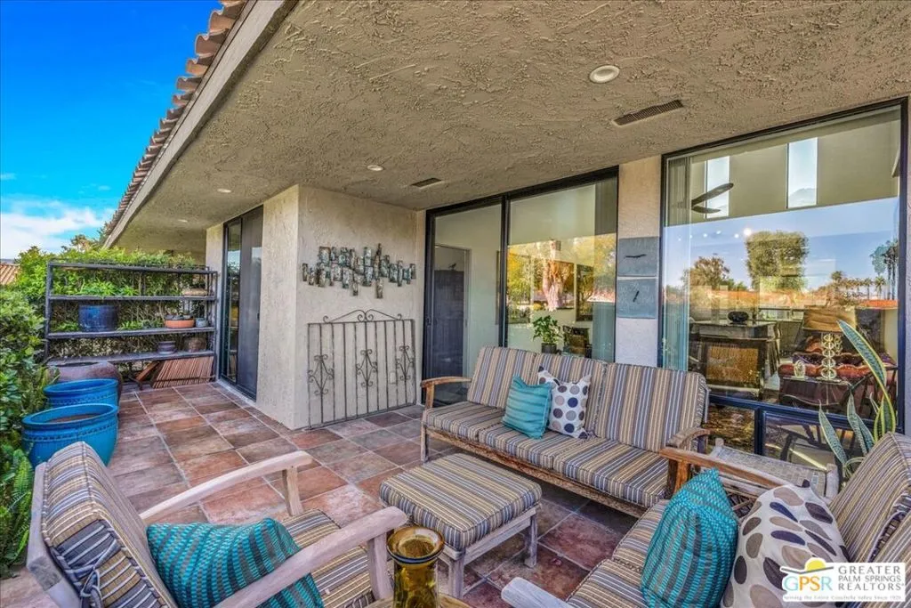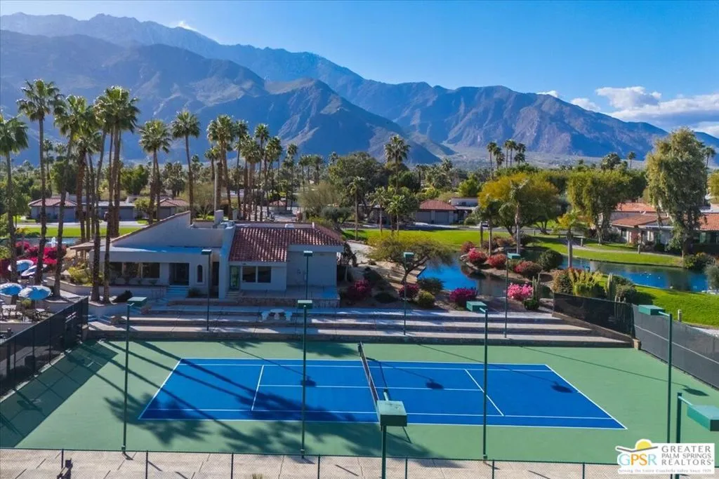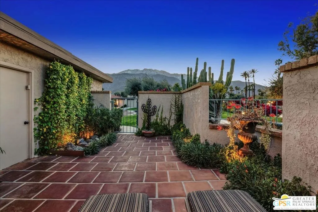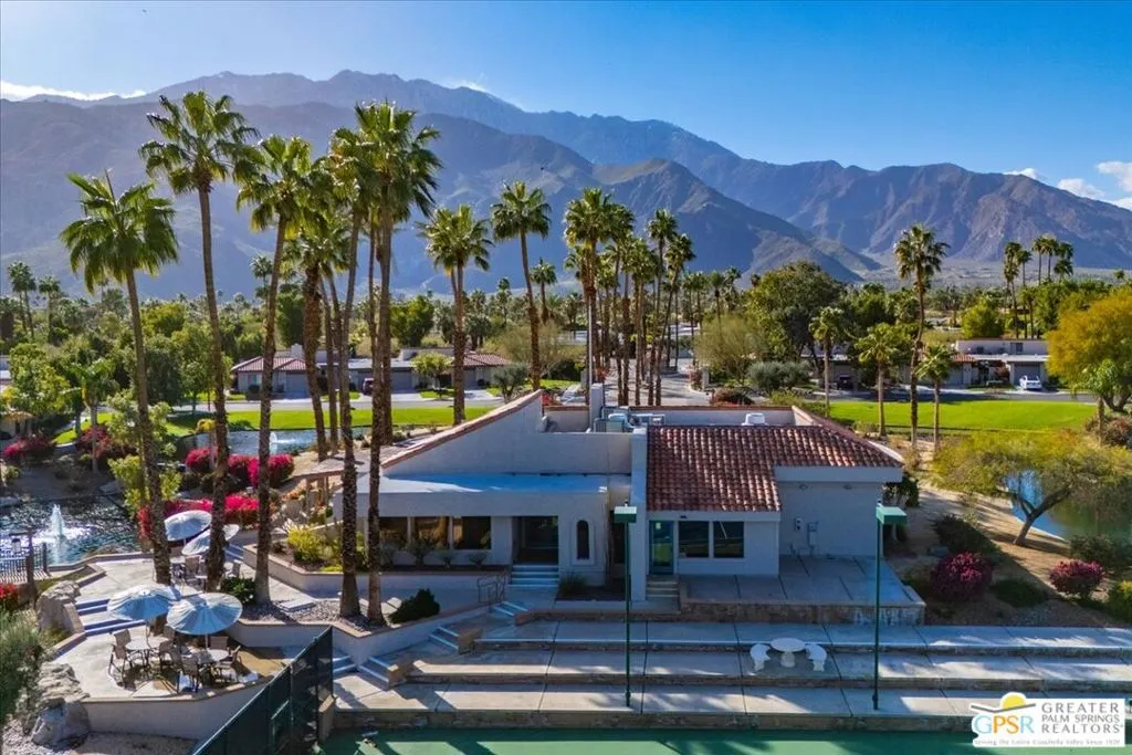 Experience the pinnacle of Palm Springs living in this meticulously reimagined 1,252-square-foot residence. Every inch of this single-level, two-bedroom, two-bath home has been transformed with luxury materials and thoughtful attention to detail. The open-concept layout is centered around a show-stopping Chef's kitchen, anchored by a 12-foot granite waterfall island with ample integrated storage, top-of-the-line Bosch stainless steel appliances, and a professional Zephyr range hood. Custom cabinetry with dovetail and soft-close finishes provides a sophisticated, tailored feel. From sunset cocktails to gourmet dinner parties, this Chef's kitchen blends high-design aesthetics with pro-grade performance for a truly elevated entertaining experience. The interior is bathed in light by added clerestory windows and premium Milgard energy efficient windows and doors. Porcelain tile floors flow seamlessly into the bathrooms, which feature custom tile work and lighted vanity mirrors. Additional upgrades include Bali Blinds, custom California Closets, Pelican water filtration system, a 16 Seer Rheem HVAC unit and recessed lighting. Enjoy true indoor-outdoor living from the front and back patios with hand-laid Saltillo tiles and breathtaking panoramic mountain views. Positioned on an incredible interior lot on a quiet cul-de-sac by the pond, bridge and walkways, you are just steps from one of the desert's most beautifully landscaped gated enclaves. Set within 43 acres of mature, park-like grounds, this premier gated community offers the ultimate desert playground with six sparkling pools, pickleball, and tennis courts. It is a serene sanctuary that feels worlds away, yet sits just minutes from the iconic energy of downtown Palm Springs. Impeccably reimagined and perfectly positioned, this isn't just a home; it's your new desert masterpiece.