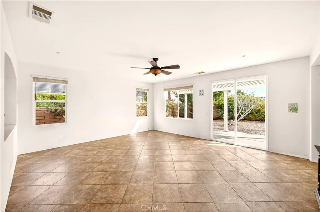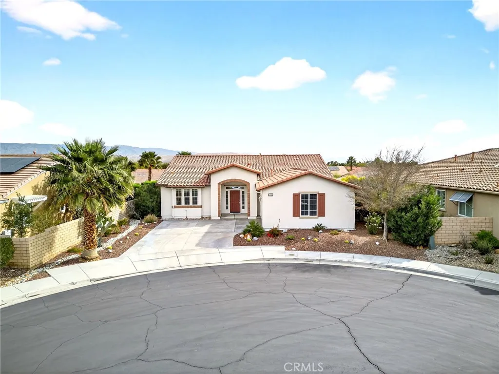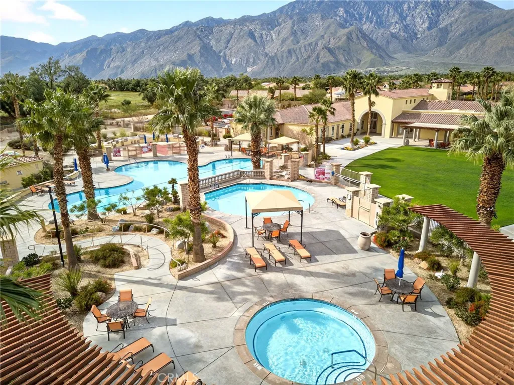 Welcome to the prestigious Four Seasons gated 55+ community in beautiful Palm Springs. This stunning 2,288 sq. ft. single-story home offers 3 bedrooms and 2 bathrooms with an open, airy floor plan and is ideally situated on a quiet cul-de-sac. The home features extensive 18” ceramic tile flooring and 9’ ceilings, creating a bright and spacious feel throughout. The gourmet kitchen showcases granite countertops, abundant cabinetry, a large center island, and a sunny breakfast area with beautiful mountain views. The formal dining room and expansive living room are perfect for entertaining and family gatherings. The spacious primary suite includes a huge walk-in closet and a luxurious en-suite bathroom with dual vanities, a relaxing jetted tub, and a step-in shower. An indoor laundry room with a utility sink provides direct access to the 2-car garage. Step outside to your private backyard retreat featuring low-maintenance desert landscaping, a concrete patio with an Alumawood patio cover, mature shrubbery, and fruit trees; recently redesigned with natural desert elements for both beauty and ease of care. Additional highlights include vinyl window blinds throughout and five ceiling fans. Residents of Four Seasons enjoy resort-style amenities at “The Lodge,” including a clubhouse ballroom, fitness and aerobics studios, game room, library, swimming pools, spas, tennis and pickleball courts, BBQ pavilion, scenic walking trails, and a full calendar of social events. HOA includes Frontier fiber internet. Located just minutes from downtown Palm Springs, fine dining, designer shopping, casinos, entertainment, and medical facilities—experience the ultimate Palm Springs lifestyle where luxury and convenience come together.
