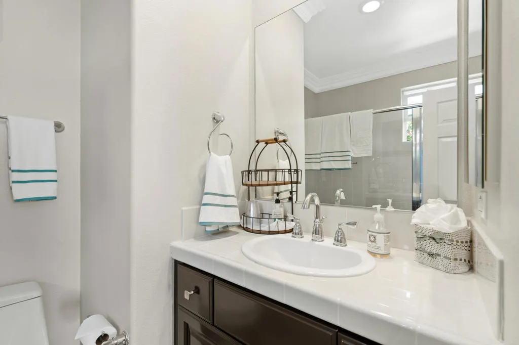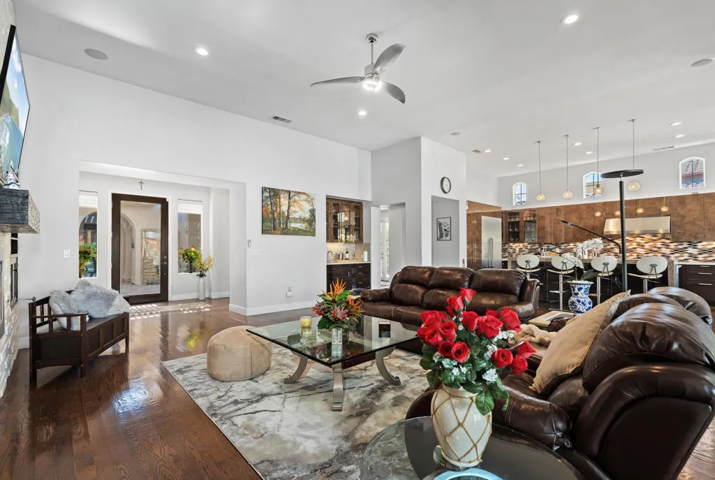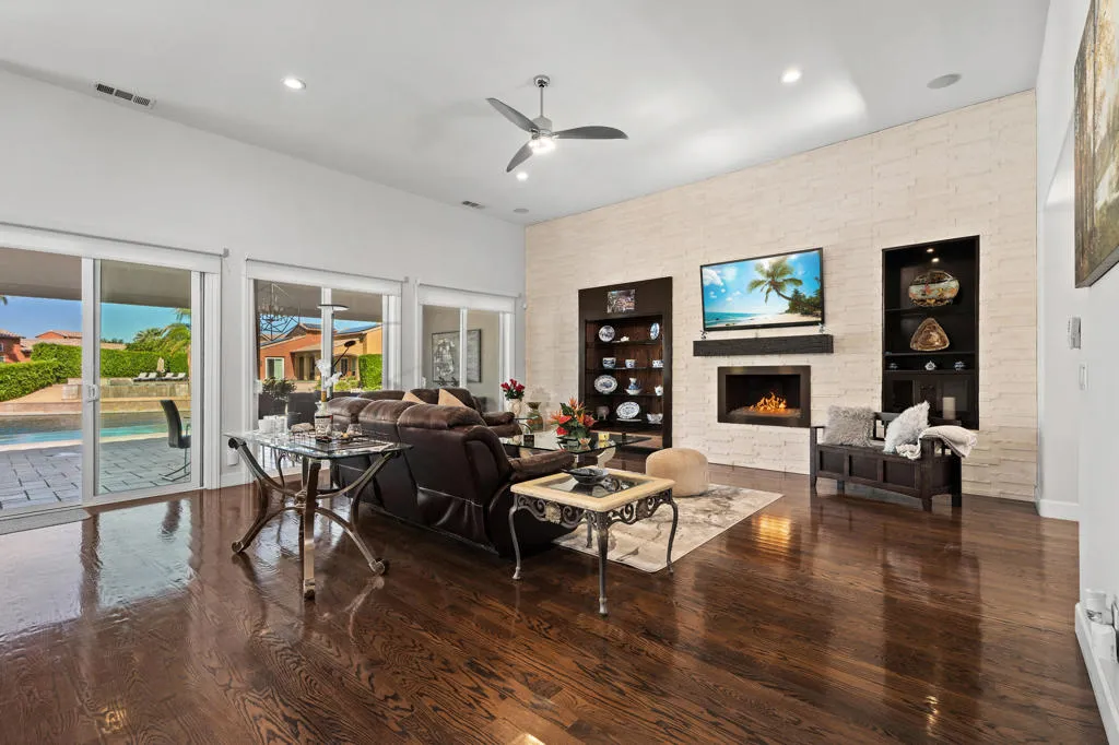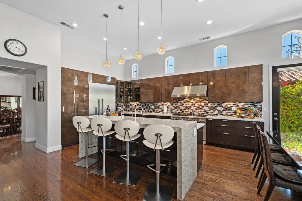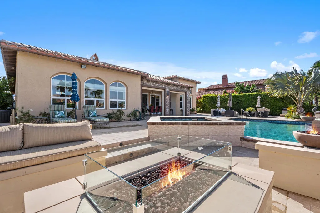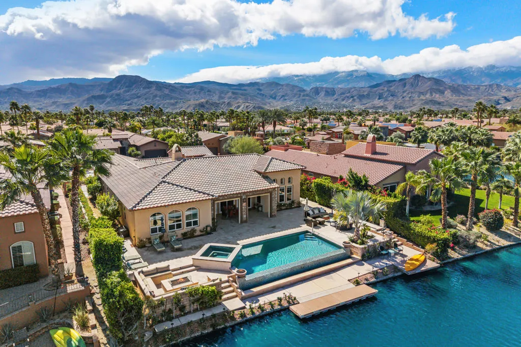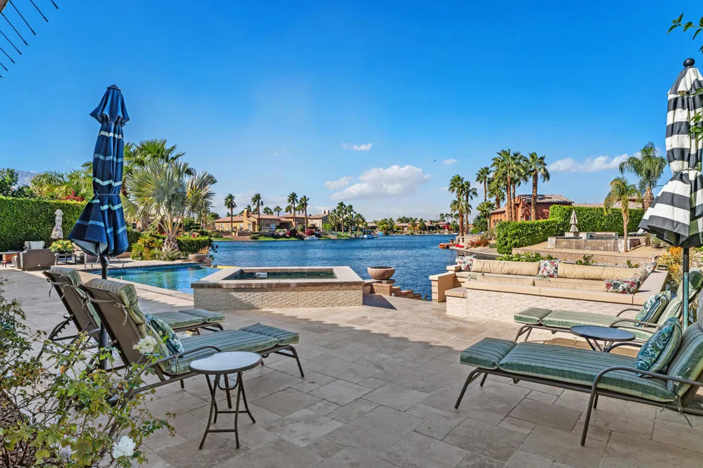 Experience a truly distinctive desert waterfront lifestyle in Santo Tomas, a private gated enclave in Rancho Mirage centered around a serene nine-acre lake. Perfectly positioned on the water's edge, this reimagined luxury residence showcases uncompromising design and exceptional upgrades throughout. There was no expense spared in creating a resort-caliber outdoor retreat, highlighted by a modern infinity-edge saltwater pool with raised spa and stunning glass tile detailing. The completely redesigned backyard offers multiple entertaining spaces, including a built-in firepit lounge, a separate lower dock level for lakeside relaxation, expansive travertine surfaces, manicured landscaping with assorted fruit trees, and covered al fresco dining--all framed by tranquil water views. Inside, the expertly curated chef's kitchen impresses with a premium stainless steel appliance suite by Thermador, high-end Italian custom gloss cabinetry, stone countertops, and a striking designer backsplash. The grand living area captures breathtaking pool and lake vistas and features a dramatic stone-and-tile accent wall, raised fireplace, and a beautiful display cabinet. The elegant primary retreat offers a spacious spa-inspired ensuite bath, while a voluminous detached casita filled with natural light provides luxurious accommodations for guests. Classic oak hardwood flooring has been beautifully remodeled throughout most of the main house, enhancing the home's warm yet contemporary aesthetic. A misting system in all common exterior areas ensures year-round comfort. The extraordinary courtyard--one of the finest you will encounter--adds yet another inviting space to gather and unwind. As a resident of Santo Tomas, homeowners also enjoy fitness and dining privileges at adjacent Mission Hills Country Club, all included with a remarkably low monthly HOA. This is desert luxury living at its most refined--waterfront, private, and designed for unforgettable entertaining. Close to shopping, entertainment, golf, and Eisenhower Medical Center.