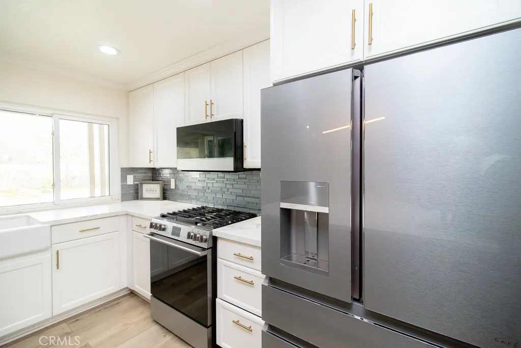 The Main House itself has 3 Bedrooms, 2 Bathrooms, 2-Car Garage, and RV Access. As you enter the main home, you’re greeted by a thoughtful layout with a living room to the left and a formal dining room to the right. The home immediately impresses with vaulted wood-beam ceilings, creating an open and airy feel. Fresh interior paint enhances the bright, inviting atmosphere throughout.