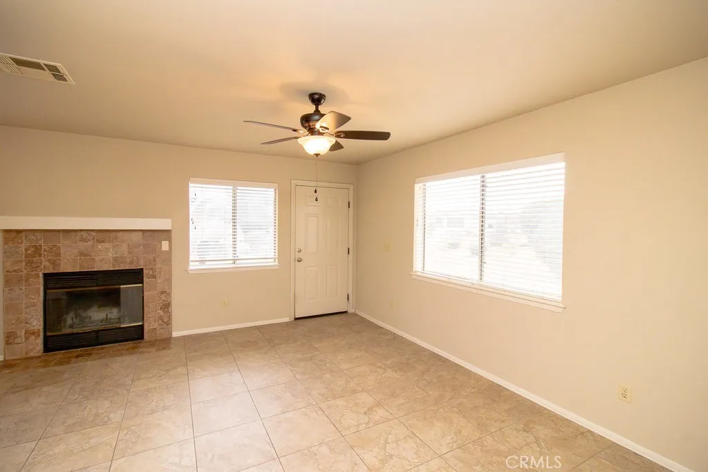The living room and family room share a dual fireplace, perfect for cozy evenings. The remodeled kitchen, completed in 2021, features updated finishes and comes equipped with a stove, microwave, and dishwasher. The air conditioner is approximately six years old, offering peace of mind for year-round comfort. All windows throughout the home have been upgraded to WeatherTech windows.