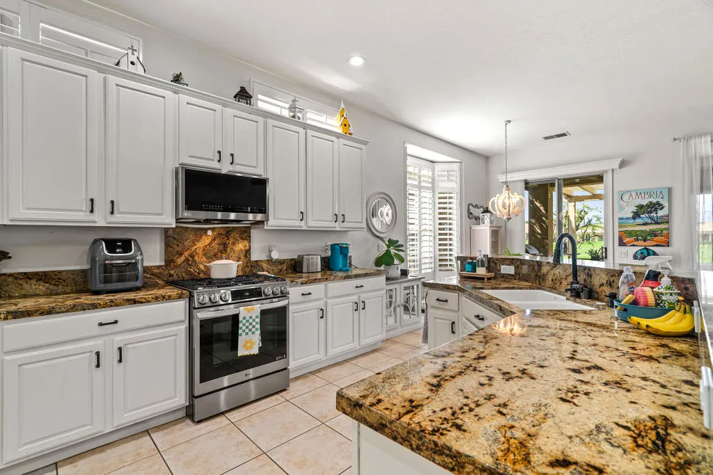 Stunning Golf Course & Mountain Views!Pride of ownership shows in this move-in ready home featuring the popular Merion floor plan, perfectly situated on the 10th fairway in Heritage Palms CC. Offering 2BD/2BA plus a den/office and 1,720 SF, this home highlights an Open Great Room design with a dramatic slab granite island, newer stainless steel appliances, tile flooring, carpeted bedrooms and plantation shutters. Recent upgrades include freshly painted interior, updated electrical panel and wiring with LED recessed lighting, ceiling fans, and more. The spacious primary suite showcases bay windows, a walk-in closet with custom organizers, and panoramic golf course views. Outdoors, enjoy a resurfaced north-facing patio with Alumawood cover and built-in gas BBQ, plus a pavered driveway that adds curb appeal. The garage offers epoxy flooring and a third bay for golf cart storage. Heritage Palms is a 55+ active adult community with championship golf, pools, tennis & pickleball, fitness center, and remodeled restaurant/bar. Resort-style living at its best!