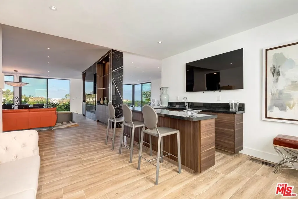 Absolutely breathtaking city and hillside views define this single-story contemporary in prime Bel Air. Featuring 4 bedrooms, 5.5 baths, and a dedicated office, this fully remodeled & move in ready residence showcases sleek, modern design and a sophisticated, contemporary aesthetic throughout. Fully furnished with designer appointments and fabulous artworks. Sun-drenched interiors with expansive walls of glass seamlessly connect indoor and outdoor living. A spectacular backyard retreat with a pool, spa, and oversized entertainer's patio all set against panoramic, head-on views. Designed for both grand-scale entertaining and effortless everyday living with an impressive living room, formal dining area, and a lounge-style wet bar. The open-concept kitchen flows directly into the family room, creating a true gathering space at the heart of the home. A luxurious large primary suite opens to the backyard and features two private bathrooms with two oversized walk-in closets. Bedrooms 2 & 3 offer generous proportions with en-suite baths, while a 4th bedroom located just off the kitchen provides flexibility for guests or staff. Spacious three-car direct-entry garage and convenient circular driveway. Completely private and serene, this is a rare opportunity to rent a single-story, move in ready contemporary with extraordinary views in one of Los Angeles' most coveted neighborhoods. Also available short term, turn-key at higher rental rate.