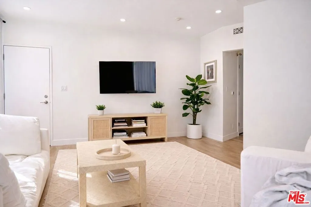 Tucked just a half block off coveted Montana Avenue, this beautifully updated first-floor residence offers the perfect blend of style, convenience, and modern living. Flooded with natural light, the open layout showcases brand-new wood flooring, recessed lighting, and elegant crown molding throughout. The modern kitchen features sleek shaker cabinetry, stainless steel appliances, and a clean, functional design perfect for easy weeknight meals or hosting friends. Thoughtfully configured as a smaller 2-bedroom that lives like a spacious 1-bedroom plus dedicated office or flex space, this layout is ideal for today's work-from-home lifestyle giving you separation between living and productivity without sacrificing comfort. Both bathrooms have been fully renovated with classic subway tile, new shower doors, and updated fixtures, delivering a fresh, spa-like feel. Enjoy the convenience of a dedicated private laundry room just steps from your front door, making everyday living seamless while maximizing interior space. Located in one of Santa Monica's most desirable neighborhoods, you're just moments from Montana Avenue's best cafes, fitness studios, restaurants, and boutiques perfect for an active, walkable lifestyle. A rare opportunity to live, work, and unwind in one of LA's most sought-after locations.
