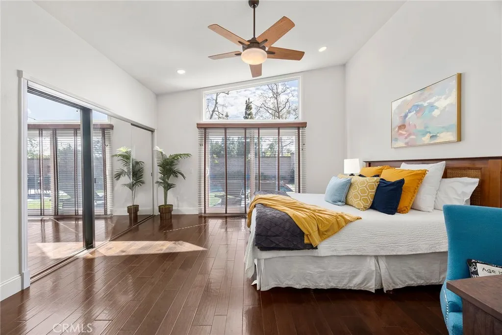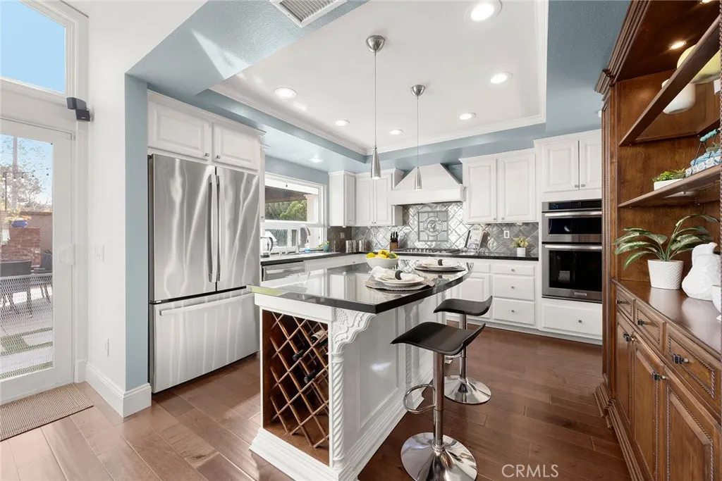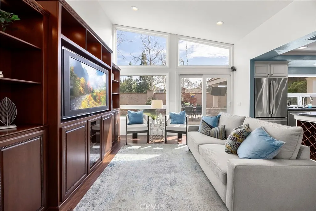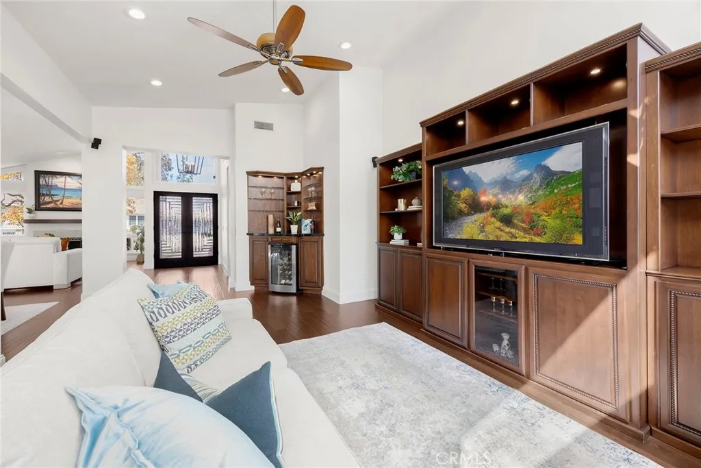 Welcome to this truly magnificent Yorba Linda home where thoughtful upgrades and exceptional indoor-outdoor living come together beautifully. From the moment you arrive, the custom double glass front doors set the tone, inviting you into a residence where nearly every detail has been enhanced. Inside, rich wood flooring flows throughout the home, complemented by recessed lighting that creates a warm, modern ambiance. The dining room has been opened to the family room, creating a spacious great-room feel anchored by a custom entertainment center—perfect for everyday living and entertaining alike. A stylish custom bar with granite counters and glass shelving is tucked seamlessly into the family room, while added French doors bring in natural light and easy access to the outdoors. The remodeled kitchen is both functional and stunning, featuring a center island, custom hutch, upgraded cabinetry, granite countertops, and an eye-catching backsplash. High-end appliances include a 5-burner LG cooktop, KitchenAid oven and microwave, dishwasher, and a wine cooler conveniently located in the bar area. Down the hall, you’ll find a beautifully remodeled hall bathroom, followed by the spacious primary suite. The primary bathroom has been completely reimagined into a true showpiece, offering a spa-like retreat. Three additional bedrooms provide flexibility for family, guests, or home office needs. An indoor laundry room with both gas and electric connections adds everyday convenience. Step outside and experience the ultimate in backyard living. The Pebble Tec pool and spa have been retiled and resurfaced, with a new pool heater added in 2024. A separate poolside bathroom adds functionality, while the fully powered cabana—complete with lighting and a TV—creates the perfect entertainment hub. Nearby, the BBQ island is equipped with a two-burner cooktop, fireplace, refrigerator, and warming drawer, all surrounded by thoughtfully designed landscape lighting, outdoor speakers, and charming string lights. Additional upgrades include exterior re-stucco and paint, a newer roof, custom gates, a tankless water heater, and a full Lorex security system with six cameras currently connected. This is a home designed for comfort, entertaining, and enjoying the best of Southern California living—inside and out.