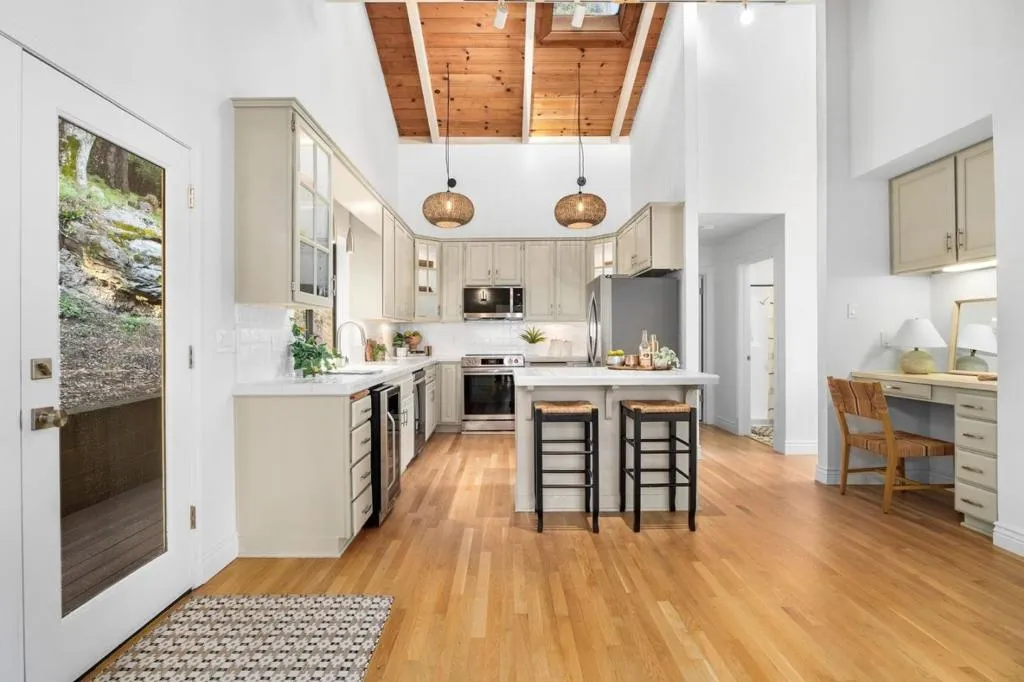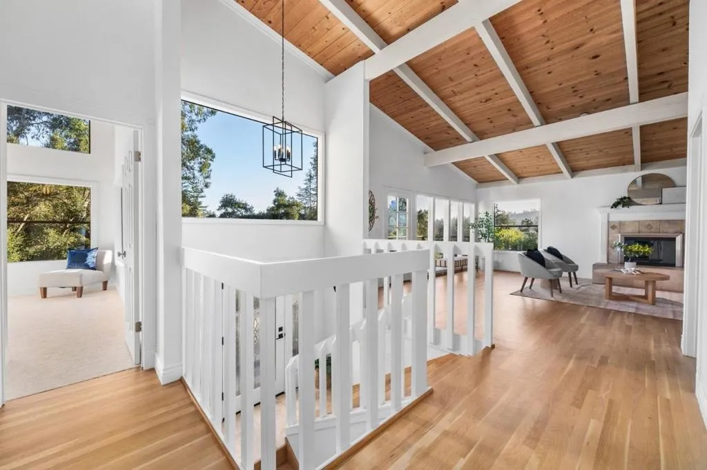 Set on an acre in Scotts Valley, this home offers that rare blend of space, warmth, and everyday convenience, just minutes to Highway 17 and top-rated Scotts Valley schools. Inside, vaulted ceilings and skylights fill the home with natural light, highlighting refinished hardwood floors. Upstairs, the great room is the heart of the home, where the kitchen, dining, and living areas come together in one expansive, light-filled space framed by a wall of windows with treetop views. The kitchen is both welcoming and functional, featuring new stainless steel appliances including a wine fridge, tile counters, and illuminated display cabinetry, flowing seamlessly to the dining area and out to the sunset-view deck. The home lives beautifully with two generous living spaces and two fireplaces, offering flexibility for gathering, relaxing, or entertaining. Upstairs, the primary suite feels like its own retreat with vaulted ceilings, a walk-in closet, and a travertine bath featuring a jetted soaking tub and spacious shower. Multiple decks extend the living spaces outdoors, creating inviting areas to enjoy the peaceful setting. The pool adds a fun, resort-like feel, while a two-car garage, yard and ample parking provide room for an RV or boat. A private country setting just minutes to town!