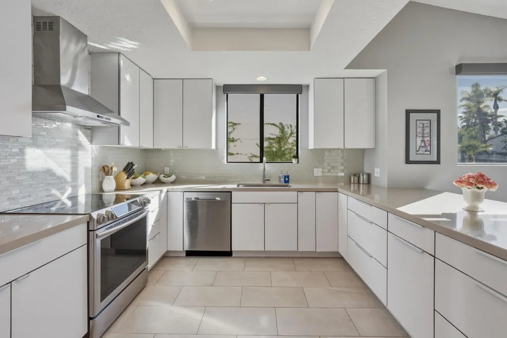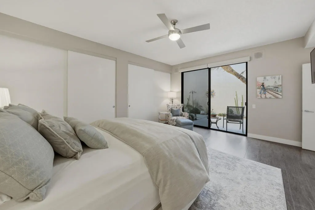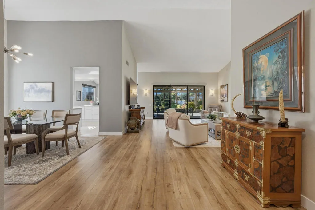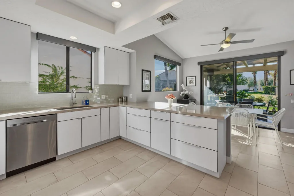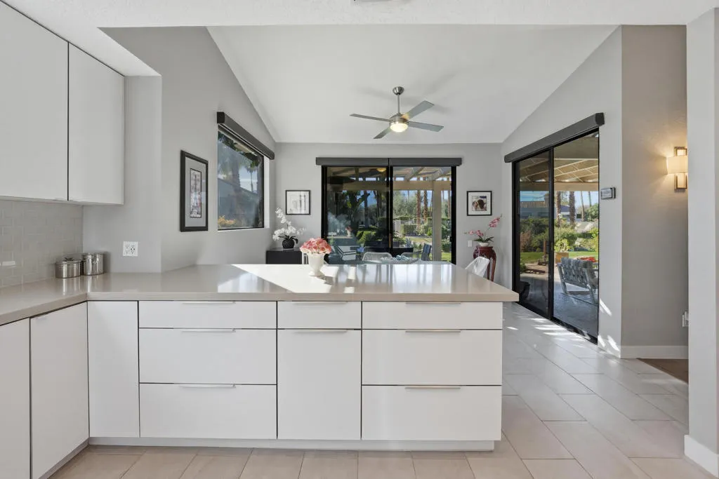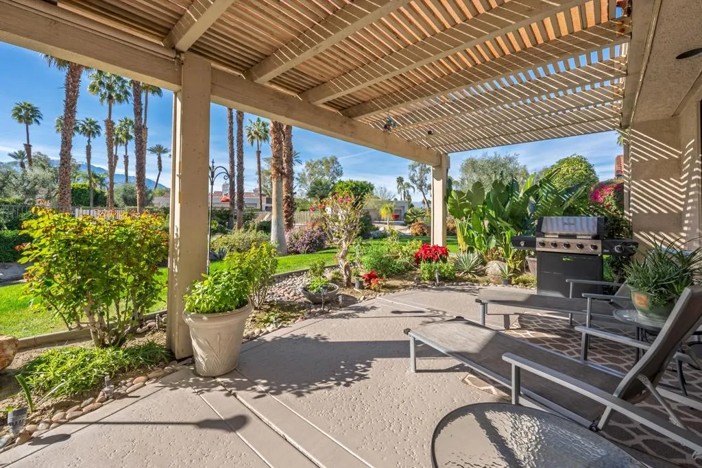 Set behind the gates of Mission Hills Country Club, this beautifully remodeled, detached residence offers an exceptional blend of privacy, elegance and breathtaking natural surroundings. Positioned in a premier west-facing location, the home showcases sweeping views of the San Jacinto Mountains and a cascading waterfall which flows gracefully into the water, creating a peaceful, resort-style ambiance that defines this extraordinary setting. Inside, the home has been thoughtfully reimagined with modern finishes and a cohesive, high-end design throughout. The fully updated kitchen is both sophisticated and highly functional, featuring custom cabinetry with soft-close drawers, convenient Lazy Susan and pull-out drawer for pots and pans, solid quartz countertops, glass tile backsplash and stainless steel appliances. Every detail was carefully selected to blend modern luxury with everyday practicality including custom motorized remote shades on all windows. High-end chrome hardware --from door handles to upgraded hinges - adds a sleek, polished touch throughout the home, while a newer HVAC system ensures comfort in every season. The bedroom accommodations are equally impressive. Three oversized bedroom suites each feature their own beautifully updated bathrooms with custom cabinetry, abundant storage, quartz countertops, double vanities, separate bath tub and shower stalls all offering comfort and privacy for family and guests alike. The primary suite is truly a retreat - generously sized and filled with natural light, with beautiful views of the mountains just outside. The redesigned primary bathroom has been fully updated with elevated finishes creating a luxurious, spa-inspired space to unwind and includes an oversized walk-in closet. Multiple outdoor living areas provide the perfect backdrop for entertaining or relaxing - from al fresco dining to quiet mornings by the water. The west-facing orientation ensures unforgettable sunset views night after night, enhancing the serenity of this private location. Completing the property is a huge two-car garage plus dedicated golf cart garage, ideal for enjoying the renowned lifestyle and amenities of Mission Hills. An extended land lease through 2121 - at a significantly lower rate than most within the community - adds exceptional long-term value. Private, polished, and perfectly positioned on the water, this is desert luxury living at its finest.