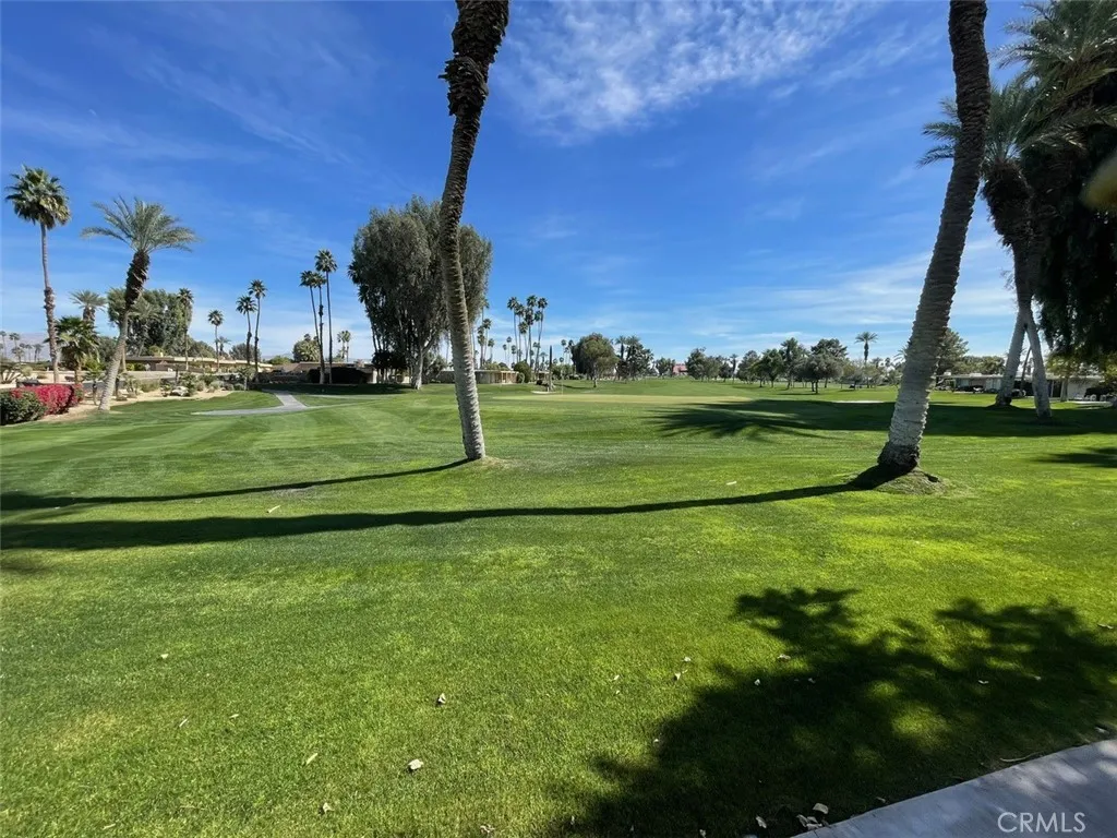 Stylish Mid-Century Modern condo plus on the golf course with terrific views!!! Floor to ceiling walls of glass overlook the first fairway of the famous Bob Hope Classic golf course. Unobstructed views over the 1st green toward the Clubhouse. The great room floor plan boasts a gas fireplace for those cooler evenings. Kitchen is complete with stainless steel appliances and is open to the great room. Two primary suites each with a slider to their own patios. There is an attached golf cart garage with a full size washer and dryer. The heated community pool/spa is just steps away. Two assigned parking space very close to the unit. Fairway Villas HOA fee is $516/mo which included water, sewer, trash, ground maintenance and building maintenance. The Bermuda Dunes Security Association monthly fee of $214 includes 24 hour guard gated security, premium cable tv and wi-fi for every household. Turn key, fully furnished with a full price offer. This is a clean, well maintained home.