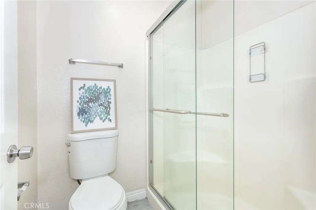 Upstairs offers a spacious primary suite serving as a comfortable private retreat, complete with a walk-in closet and an en-suite bathroom featuring a granite vanity and a separate framed glass shower. The second and third bedrooms include mirrored sliding closet doors.
