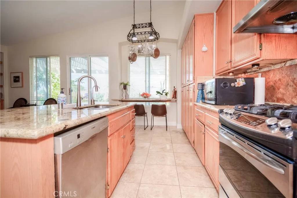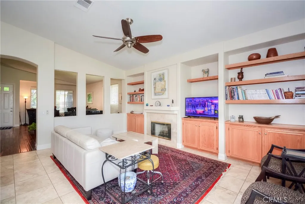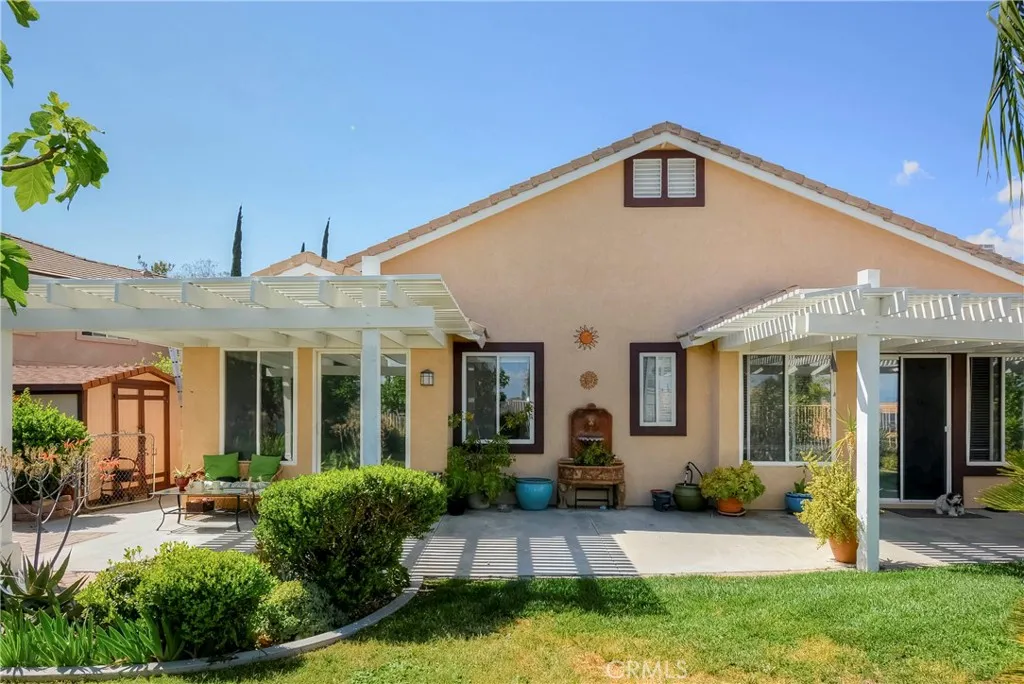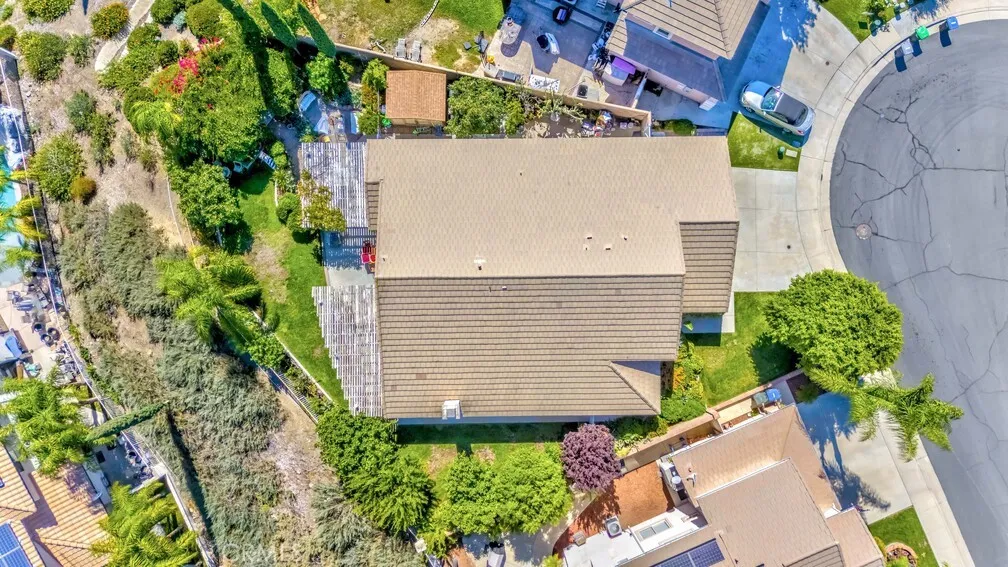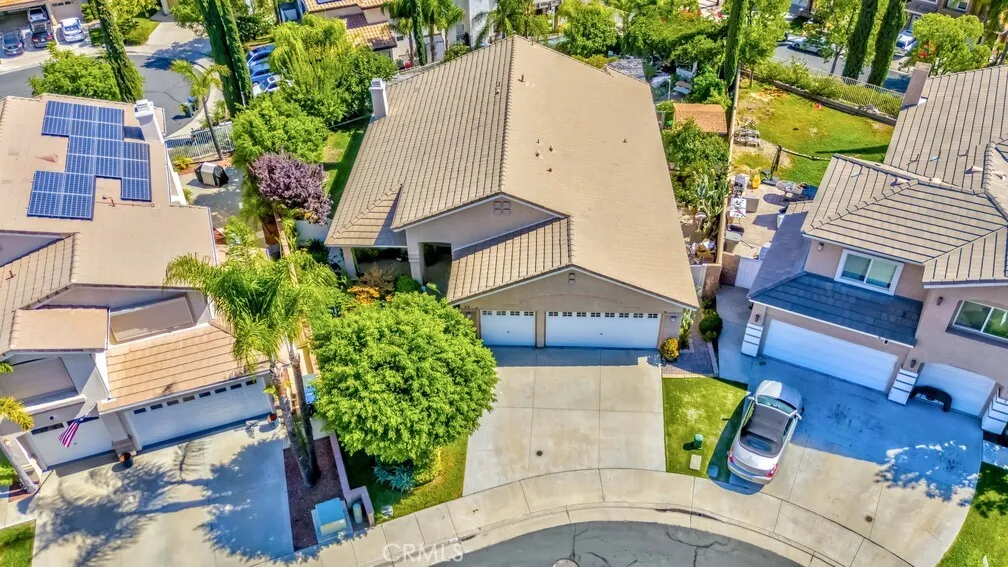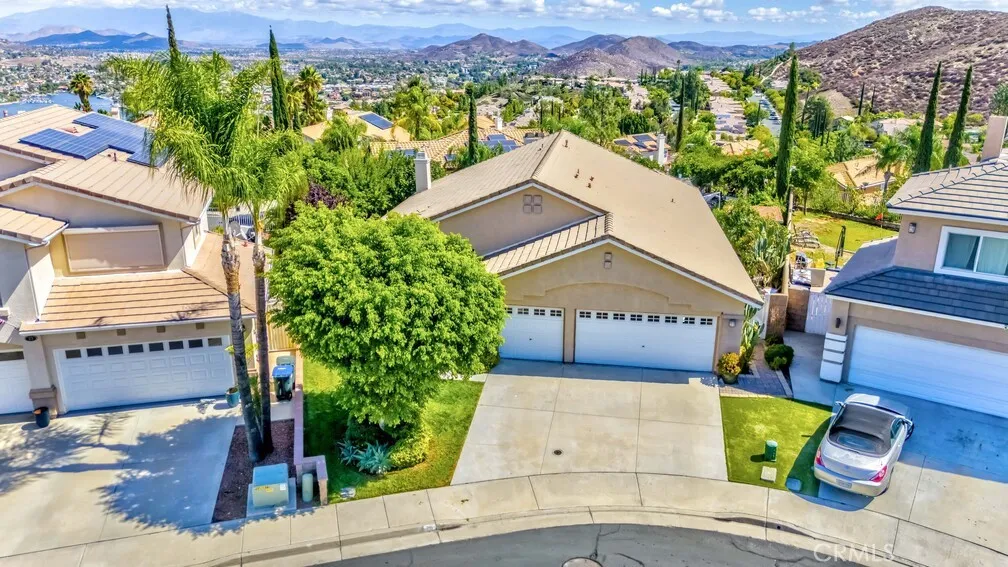 Beautiful single-story home tucked away on a quiet cul-de-sac in a highly desirable family-friendly neighborhood. Conveniently located near shopping, dining, and freeway access, this 3 bedroom and den (currently using as dinning room) can be converted to 4th bedroom and 2.5-bath residence offers both comfort and convenience. With a living space of 2,065 sq. ft and lot size of 8,276. Enjoy a spacious backyard with stunning valley views, complete with two covered lattice patios—perfect for relaxing or entertaining. The open-concept kitchen features a center island and flows seamlessly into the family room, highlighted by a cozy fireplace and custom floating shelves. The generous primary suite includes a private bath, while vaulted ceilings and a formal dining room add elegance throughout the home. 3 car garage, for extra storage space or turn to workstation. Located within walking distance to the community center and just minutes from Canyon Lake, this property also boasts numerous upgrades throughout. Home is freshly painted both interior and exterior A must-see home with space, style, and scenic charm!