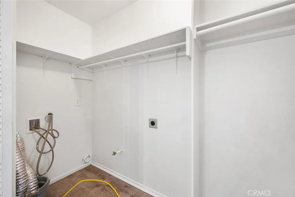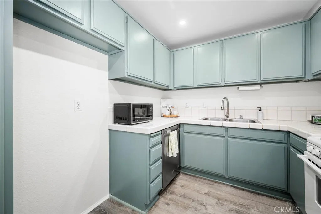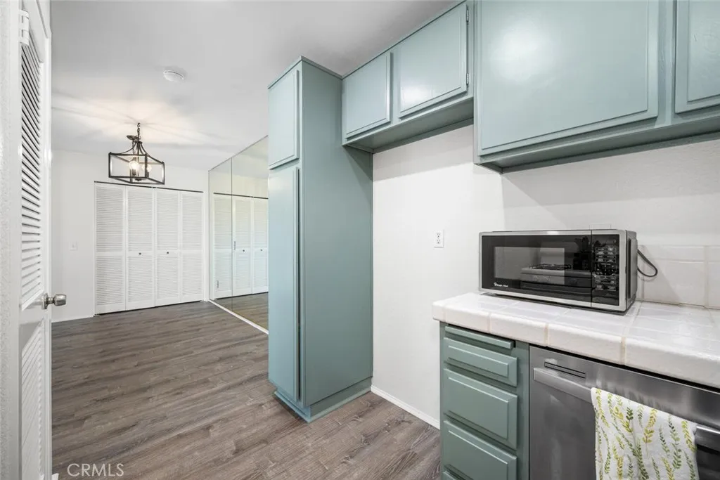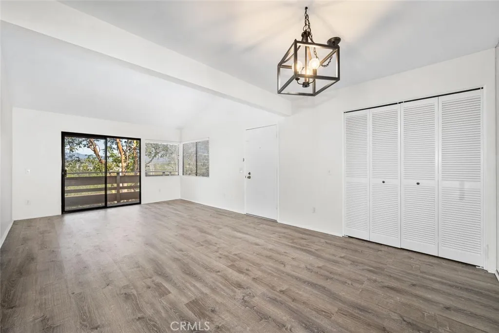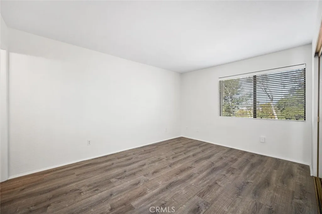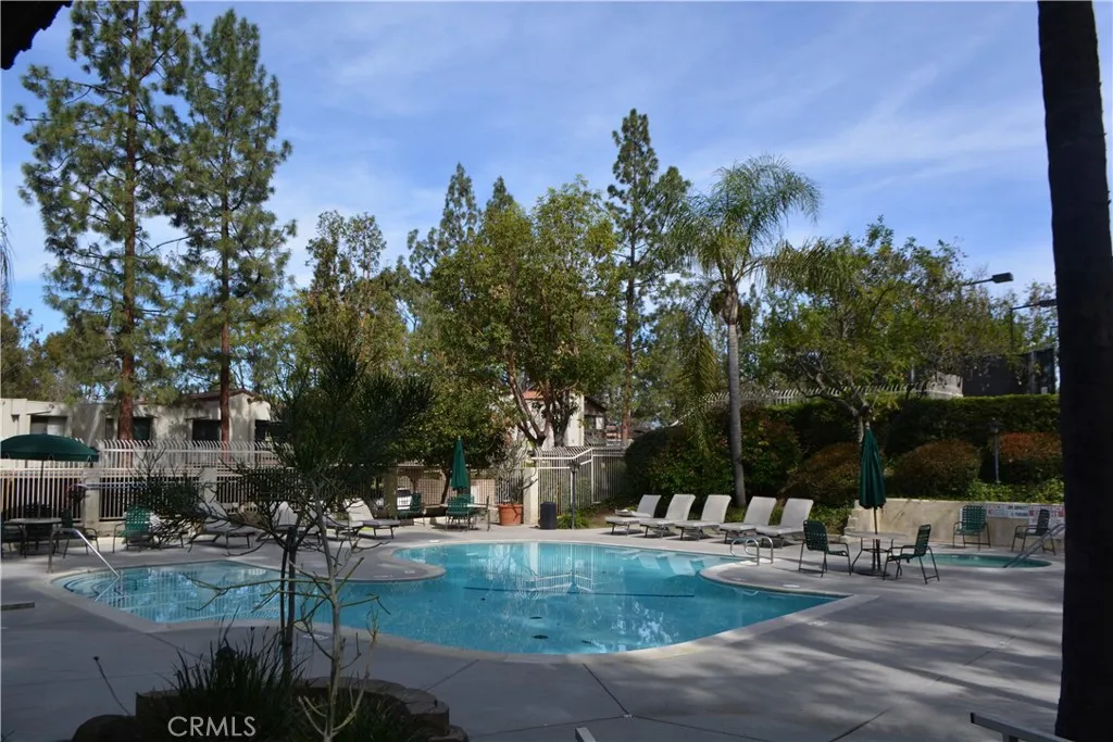 Upper level, one bedroom condo that feels like a tree house with a view of the mountains. Freshly painted in a neutral color with vinyl plank flooring throughout the home, installed 2 years ago. Living room is full of light from corner windows with east facing views and a sliding door out to the balcony. Open floorplan with living room, dining area and kitchen adjacent. Kitchen features painted cabinets, tile counters, pantry, range with hood and microwave. Spacious bedroom also has tree and mountain views with abundant closet space including built in shelves for linens. Full bathroom features updated vanity and fixtures. Mirrored doors in bedroom and mirrored wall in dining room add openness and light making the spaces feel bigger. Laundry hookups are in the unit off the dining room in a spacious closet with slatted, folding doors. Consider stackable laundry units to maximize all the available storage space. Central air and heat. Electrical panel has been upgraded. Community has 3 pools, a clubhouse, and 4 tennis courts. Retail services are available next door off of Grand Ave. Home has two assigned parking spaces, one covered and one partially covered just at the bottom of the steps, #580 and #615. Close to CSU Cal Poly and Mt. San Antonio College.