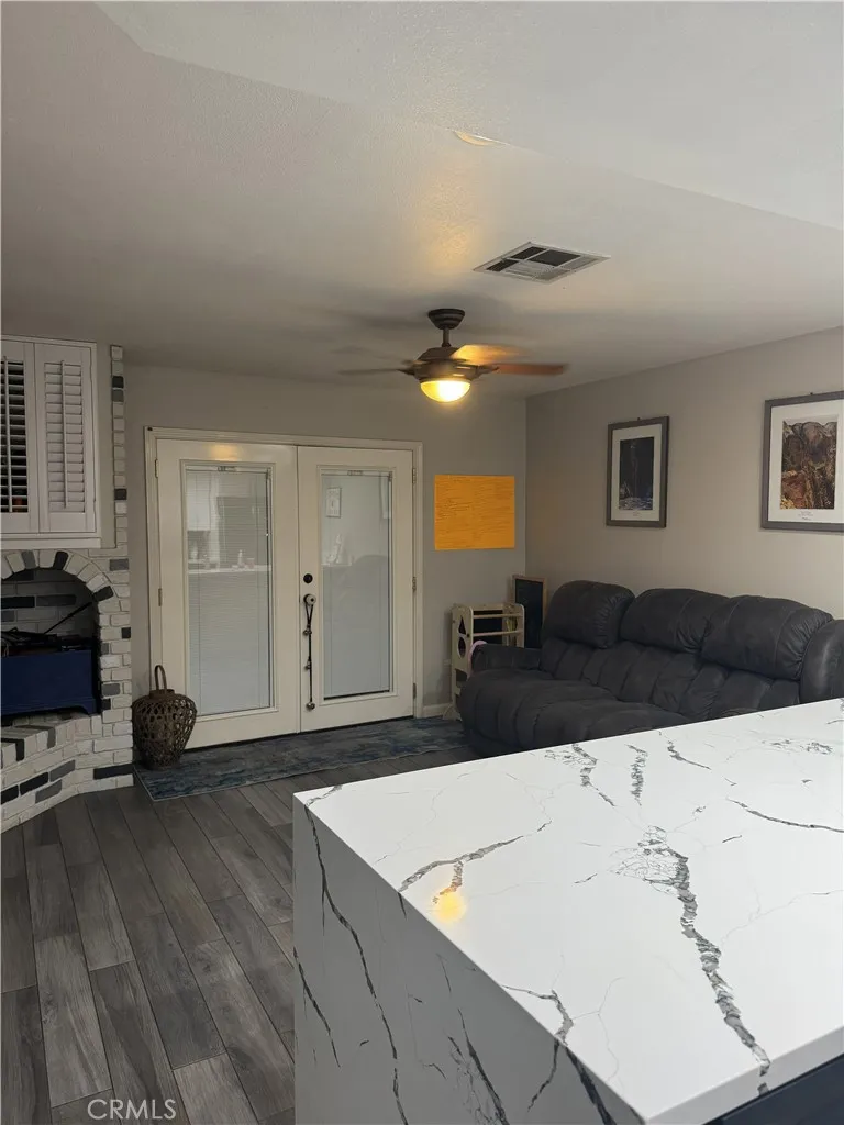 Step inside to discover a fully remodeled interior featuring wood-look tile flooring, recessed lighting, and an open, flowing layout ideal for both everyday living and entertaining. The kitchen is the heart of the home, showcasing crisp white shaker cabinetry, rich navy lower cabinets, striking quartz countertops with waterfall bookend, stainless steel appliances, a farmhouse sink, and a large island — perfect for gatherings.