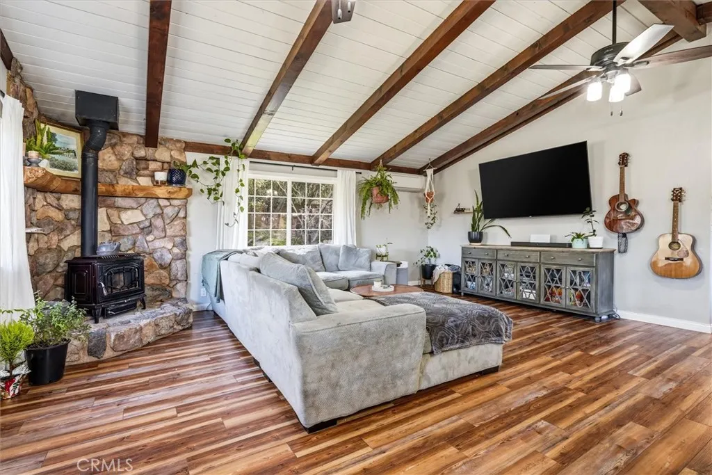 The main home features 3 bedrooms, 2 bathrooms, and an extensively remodeled interior with new flooring, fixtures, electrical outlets, switches, and dual-pane windows throughout. The show-stopping kitchen boasts quartz countertops, and premium soft-close plywood cabinetry. A wood-burning stove imported from Ireland adds warmth and character, while a new mini-split system with smart controls ensures year-round comfort.