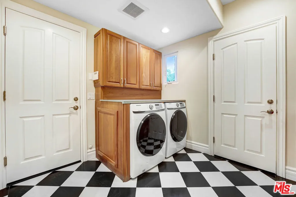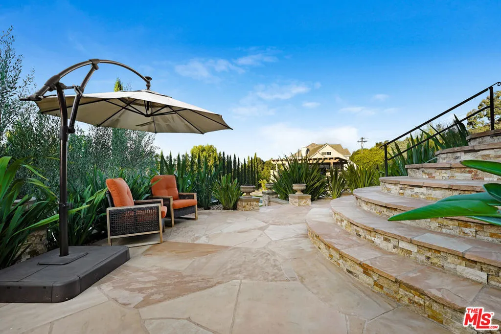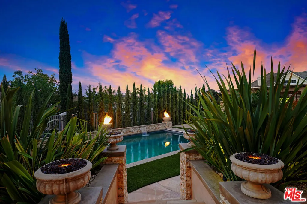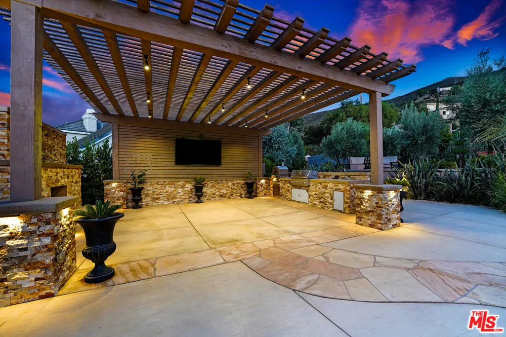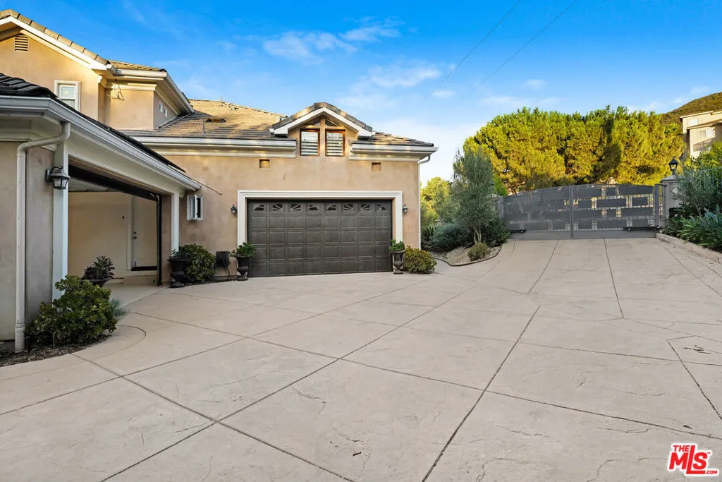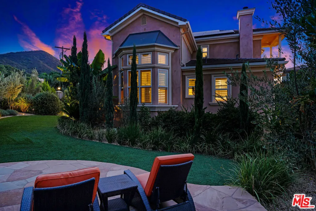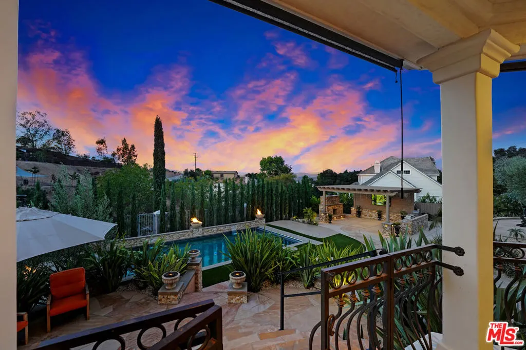 Premier Value! Stunning Mediterranean Hidden Gem! This exquisite custom home with views of Conejo Valley is set on a spacious 29,273 SqFt lot and showcases soaring ceilings and cathedral windows, providing an abundance of natural light through classic shutters. The gourmet chef's kitchen features a center island, granite countertops, stainless steel appliances, and a walk-in pantry, flowing seamlessly into the spacious family room. The luxurious primary suite offers a veranda with views, a bedroom fireplace, his-and-hers walk-in closets, separate his-and-hers toilet rooms, a soaking bathtub, and a glass-enclosed shower. On the lower level, a 530 SqFt mother-in-law studio with a private entrance includes an en-suite bathroom, kitchenette, and stackable washer/dryer. A bonus room above the garage offers large additional storage, accessible from the second floor. Enjoy the convenience of two 2-car attached garages and extra space for more vehicles in the driveway. Additional upgrades include a newer solar system, tankless water heater, dual-zoned AC, and a utility room. Step into a backyard paradise - an entertainer's dream featuring a newer saltwater pool and spa, luxurious outdoor living areas with multiple patios, and a spacious gazebo with a built-in barbecue, pizza oven, fireplace, and television. The meticulously landscaped grounds incorporate drought-tolerant plants, turf, and fruit trees. Market smart, unique and exceptional estate!