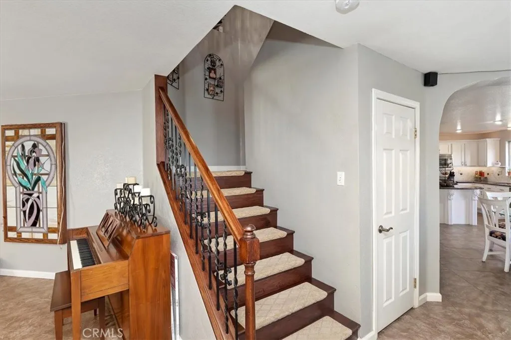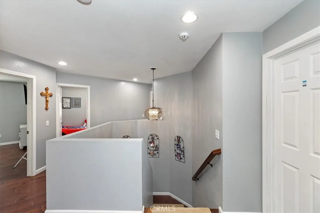 A stunning wrought iron staircase leads upstairs to five bedrooms and two bathrooms. The entire upper level features wood flooring. The primary suite offers volume ceilings and captures panoramic city light and mountain views. The primary bath includes dual sinks, a soaking tub, separate shower, and a large walk-in closet.