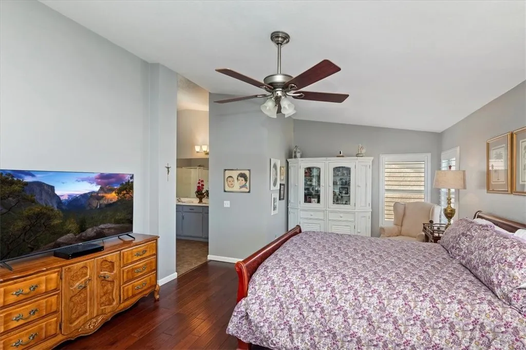 Beautiful traditional home in one of the most sought-after locations, just 10 minutes from the Orange County border and in the best school district. Offering 2,762 square feet of living space, this spacious residence features five spacious bedrooms and three bathrooms. The island kitchen is a standout, showcasing gorgeous granite countertops, a travertine backsplash, white cabinetry, a 48-inch Thermador refrigerator, stainless steel appliances, a walk-in pantry, and upper and lower cabinet accent lighting. Downstairs includes a formal living room and dining room, along with a spacious family room highlighted by an upgraded mantel and granite fireplace surround—perfect for gatherings and everyday living. A stunning wrought iron staircase leads upstairs to five bedrooms and two bathrooms. The entire upper level features wood flooring. The primary suite offers volume ceilings and captures panoramic city light and mountain views. The primary bath includes dual sinks, a soaking tub, separate shower, and a large walk-in closet. Additional features include plantation shutters, ceiling fans, solar, a three-car garage, and a beautifully maintained backyard with a pergola, guava tree, and two storage sheds. Ideally located near parks, schools, shopping, Skyline Trail and dining—with no HOA. Proudly offered by the original owners, this home has been exceptionally well maintained and is move-in ready.