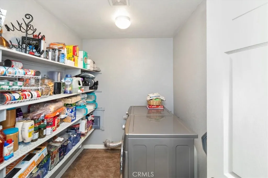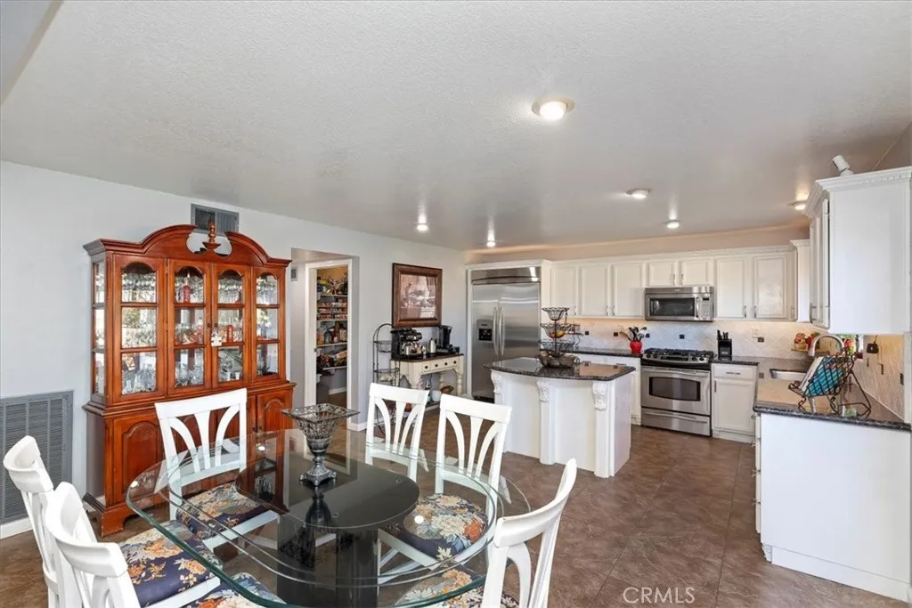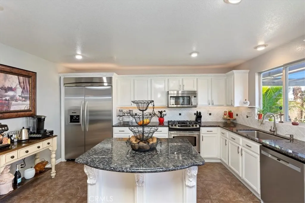 The island kitchen is a standout, showcasing gorgeous granite countertops, a travertine backsplash, white cabinetry, a 48-inch Thermador refrigerator, stainless steel appliances, a walk-in pantry, and upper and lower cabinet accent lighting.