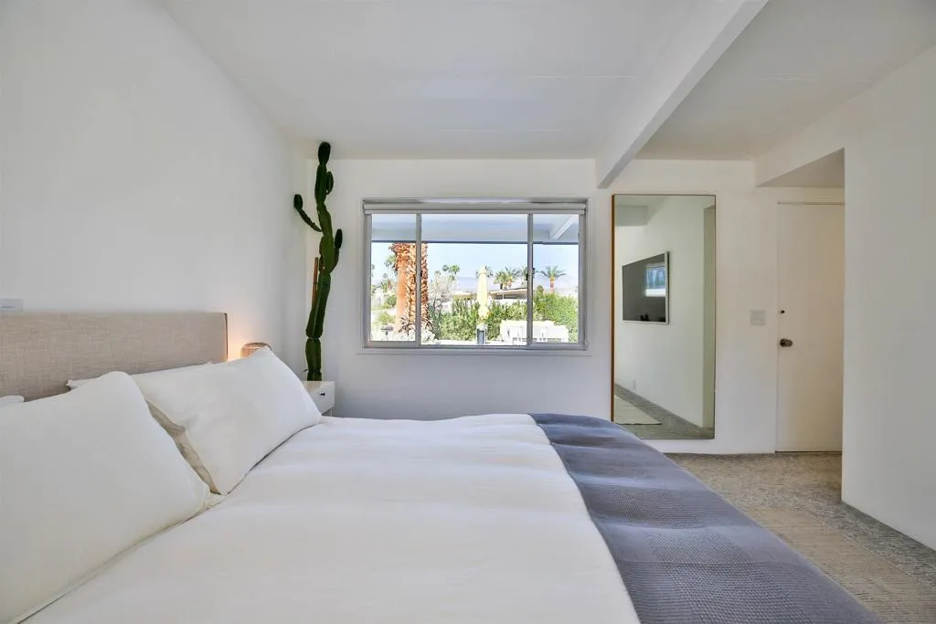 Spectacular Mid-Century Modern home right on the De Anza Golf Course. This well maintained home preserves the original charm of the De Anza cottages with clean lines, lots of windows, and an amazing view of the golf course & mountains. Walking in to this house is like stepping back in time with all the modern conveniences. From the expanded patio areas to the sparkling pool just steps away, you will love this home! Comes complete with owned solar and furnishings. This is the one you have been waiting for!