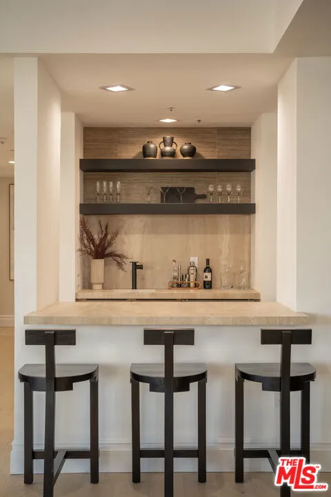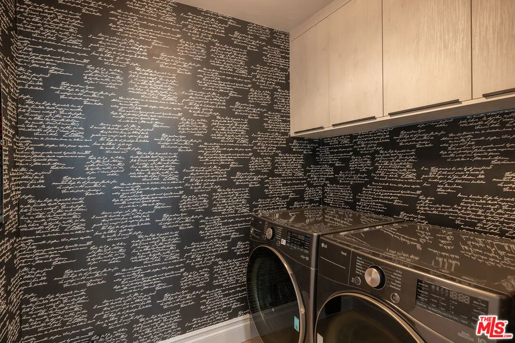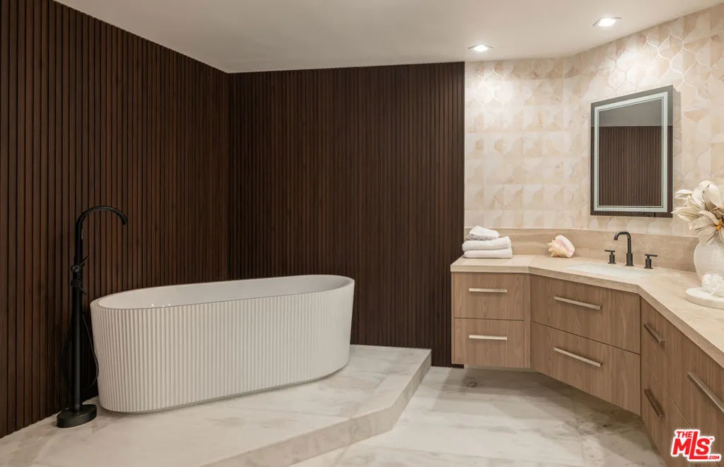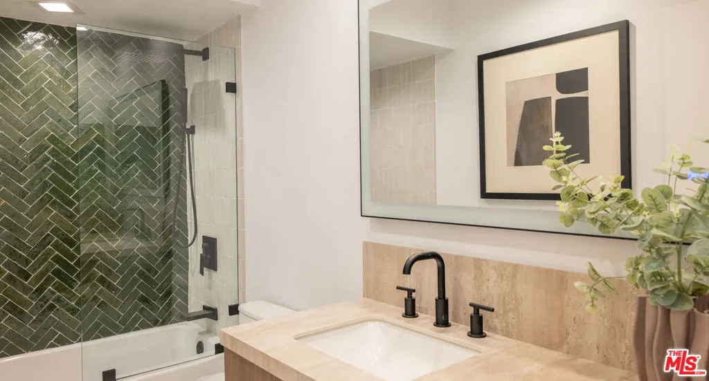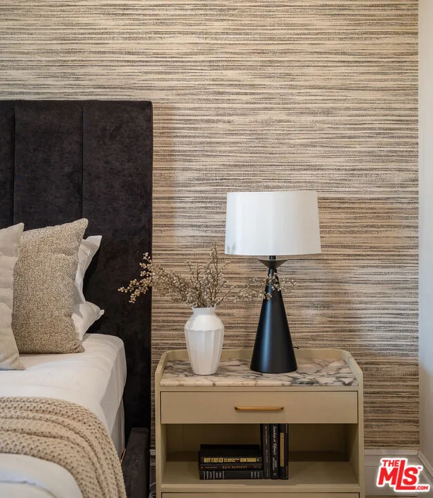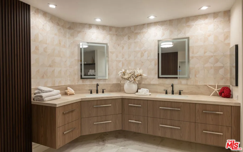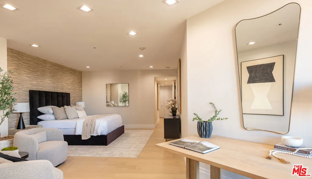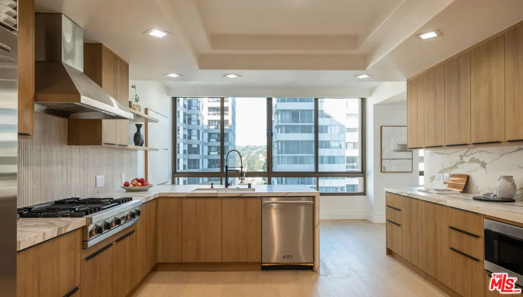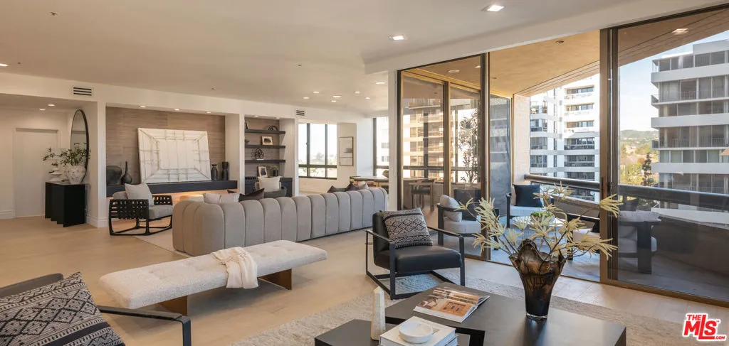 High above the Wilshire Corridor, on a northeast corner within the Mirabella, this expansive residence spans more than 2,800SF and unfolds like a private gallery in the sky. The entry foyer creates an elegant introduction, as the home opens to sweeping 180-degree views across Little Holmby and the sparkling city lights beyond. Wall-to-ceiling glass lines every room, drawing in natural light and extending the interiors outward to two balconies each tiled in reclaimed wood porcelain and accessible from every principal space. High ceilings and recessed lighting heighten the sense of volume, while newly finished, contemporary white oak hardwood floors run continuously throughout.The great room is arranged with intention, offering two distinct seating environments: a formal conversation area anchored by a fireplace and porcelain travertine accents, and a relaxed lounge oriented toward the view. A wet bar with seating supports effortless entertaining, while green and black built-in cabinetry wrapped in designer wallpaper provide curated storage. The kitchen balances function and finish with custom cabinetry featuring honed porcelain countertops and a full Viking appliance package with Sub-Zero refrigerator and Sharp micro drawer. Adjacent dining space captures the skyline as a daily backdrop.The primary suite incorporates a sitting/office area and custom closets, with an accent wall wrapped in Aztec grass cloth. The luxuriously appointed ensuite showcases marble flooring and fluted marble tile within the shower, a Thassos marble shower floor, toilet-bidet water closet and custom walnut vanity. The guest suite mirrors the level of finish, featuring honed marble and pearl handmade tile, vanity, and porcelain travertine surfaces. Additional amenities include the bespoke powder room, laundry room with brand new LG ventless washer and dryer and upgraded AC vents, a Nest smart thermostat, designer vanity pulls throughout, and LED mirrors in every bath.Residents of the Mirabella enjoy 24-hour concierge and valet, pool and spa, fitness center, EV charging, conference facilities, and recent upgrades to the motor court and common areas. HOA dues of $3,649 per month cover water, sewer, trash, gas, DirectTV, internet, and earthquake insurance. Moments from Homby Park, Beverly Hills, Century City, Westwood Village, and UCLA, the home offers the privacy and proportion of a single-family residence within a full-service high-rise setting.