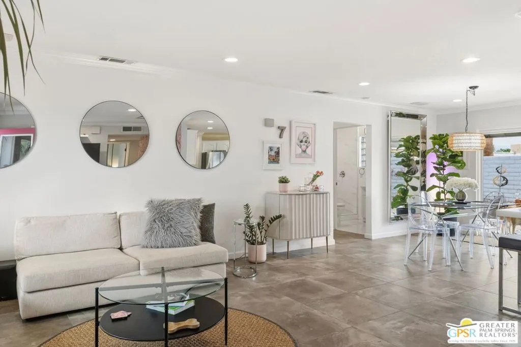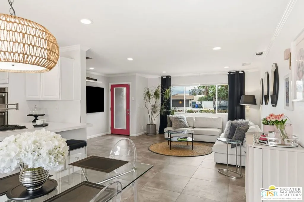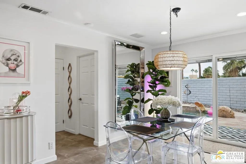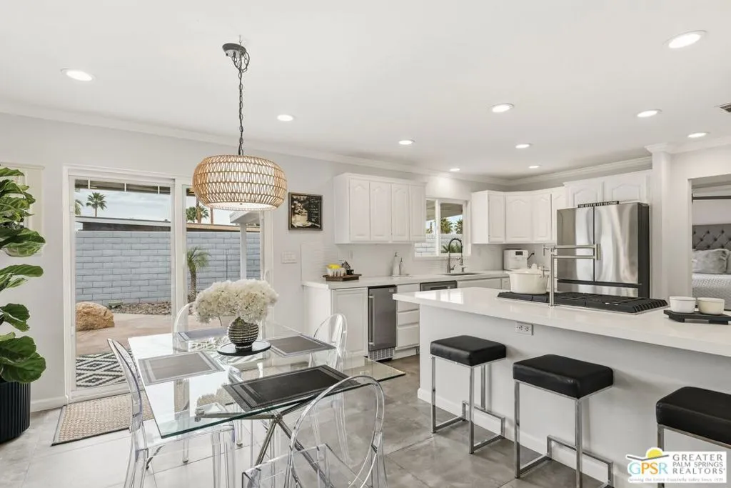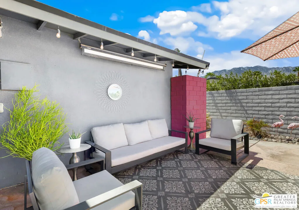 Live the Palm Springs lifestyle in this beautifully updated mid-century ranch home located in the heart of iconic El Rancho Vista Estates. This 3-bedroom, 4-bathroom home with detached casita and owned solar on land you own blends classic ranch-style architecture, modern comfort, and a fun, easy indoor-outdoor vibe all framed by wonderful mountain views. Inside, the light-filled living spaces showcase the relaxed appeal of mid-century ranch design, with clean lines, comfortable proportions, and an effortless flow that's perfect for both laid-back living and lively gatherings. The spacious living and dining areas connect seamlessly to the backyard, where the mountain backdrop adds to the home's unmistakable Palm Springs charm. The renovated kitchen is both stylish and functional, featuring new quartz countertops, a new backsplash, and new stainless steel appliances including a pot filler and built-in icemaker, along with ample cabinetry and generous prep space for cooking, entertaining, or casual everyday living. The home offers two primary suites, providing excellent flexibility for hosting guests or multi-generational living. The larger primary suite serves as a true retreat with abundant space, great natural light, a private en-suite bathroom, and a massive walk-in closet. An third guest bedroom adds further versatility for visitors, workspace, or hobbies, while the detached casita is ideal for guests, a home office, or creative studio. Outdoors, the private backyard is designed for enjoying the desert lifestyle, featuring a brand-new pergola, a large pool and spa with waterfall, and plenty of room for lounging, dining, entertaining, or letting pets roam and play. Surrounded by wonderful mountain views, it's a space made for both quiet mornings and festive Palm Springs evenings. With owned solar, new exterior paint, a water filtration system, numerous upgrades throughout, classic mid-century ranch character, and a location in one of Palm Springs' most recognizable and sought-after neighborhoods, this home delivers style, personality, and the true spirit of desert living.