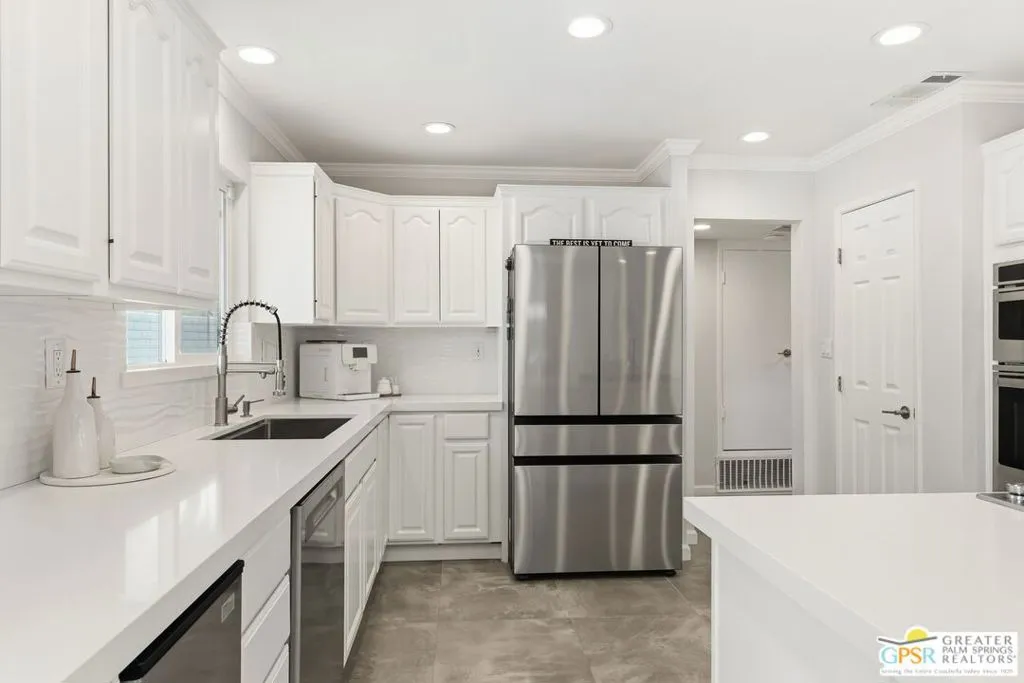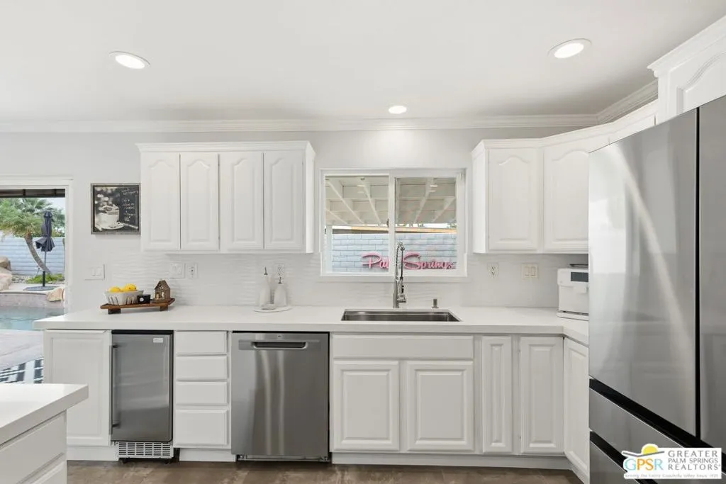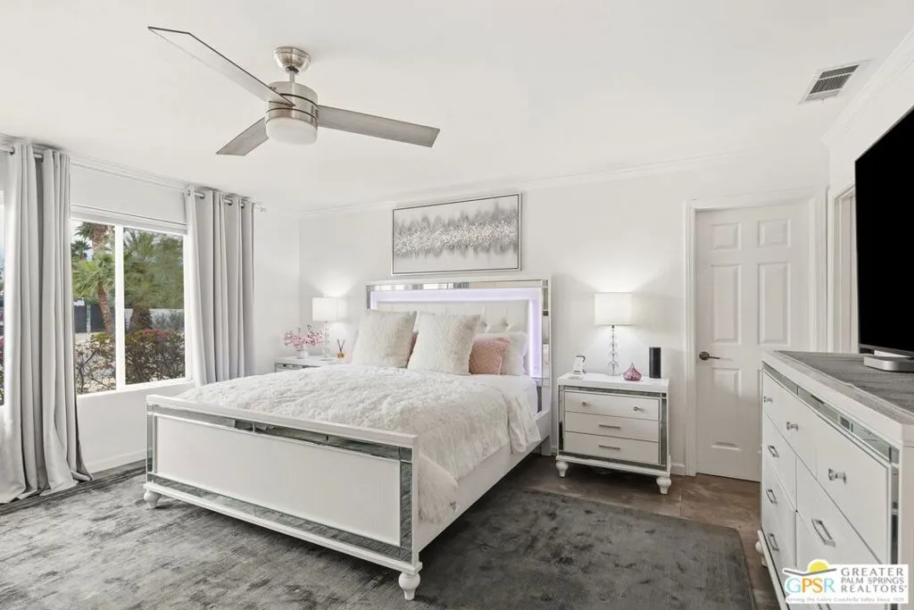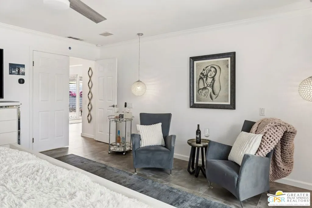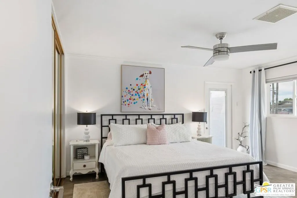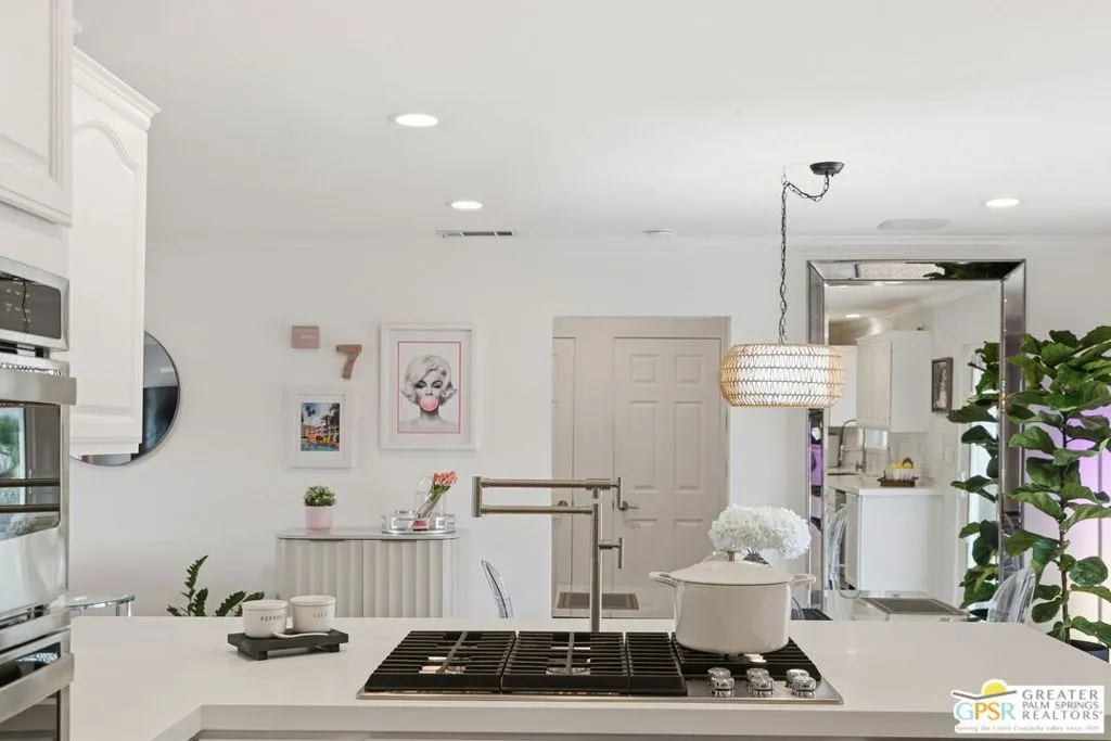 Live the Palm Springs lifestyle in this beautifully updated mid-century ranch home located in the heart of iconic El Rancho Vista Estates. This 3-bedroom, 4-bathroom home with detached casita and owned solar on land you own blends classic ranch-style architecture, modern comfort, and a fun, easy indoor-outdoor vibe all framed by wonderful mountain views. Inside, the light-filled living spaces showcase the relaxed appeal of mid-century ranch design, with clean lines, comfortable proportions, and an effortless flow that's perfect for both laid-back living and lively gatherings. The spacious living and dining areas connect seamlessly to the backyard, where the mountain backdrop adds to the home's unmistakable Palm Springs charm. The renovated kitchen is both stylish and functional, featuring new quartz countertops, a new backsplash, and new stainless steel appliances including a pot filler and built-in icemaker, along with ample cabinetry and generous prep space for cooking, entertaining, or casual everyday living. The home offers two primary suites, providing excellent flexibility for hosting guests or multi-generational living. The larger primary suite serves as a true retreat with abundant space, great natural light, a private en-suite bathroom, and a massive walk-in closet. An third guest bedroom adds further versatility for visitors, workspace, or hobbies, while the detached casita is ideal for guests, a home office, or creative studio. Outdoors, the private backyard is designed for enjoying the desert lifestyle, featuring a brand-new pergola, a large pool and spa with waterfall, and plenty of room for lounging, dining, entertaining, or letting pets roam and play. Surrounded by wonderful mountain views, it's a space made for both quiet mornings and festive Palm Springs evenings. With owned solar, new exterior paint, a water filtration system, numerous upgrades throughout, classic mid-century ranch character, and a location in one of Palm Springs' most recognizable and sought-after neighborhoods, this home delivers style, personality, and the true spirit of desert living.