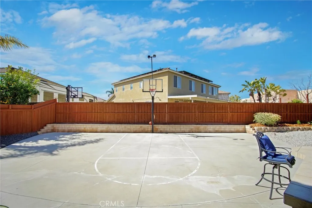 The backyard is truly an entertainer’s oasis, showcasing a saltwater pool and spa, spacious decking, firepit, aluminum patio cover, built-in BBQ island with seating, and even a small basketball court area — offering something for everyone.
