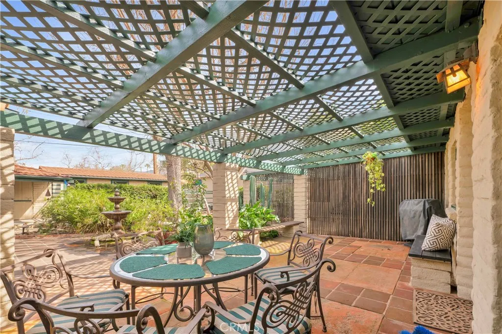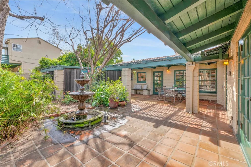 The layout offers 3 bedrooms and 3 bathrooms, including 2 en-suites, blending historic character with functional living. The kitchen, library, and primary suite open directly onto a serene back porch where a fountain and mature trees create a private, retreat-like setting designed for both creativity and calm.