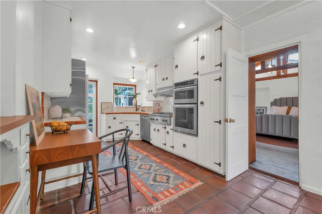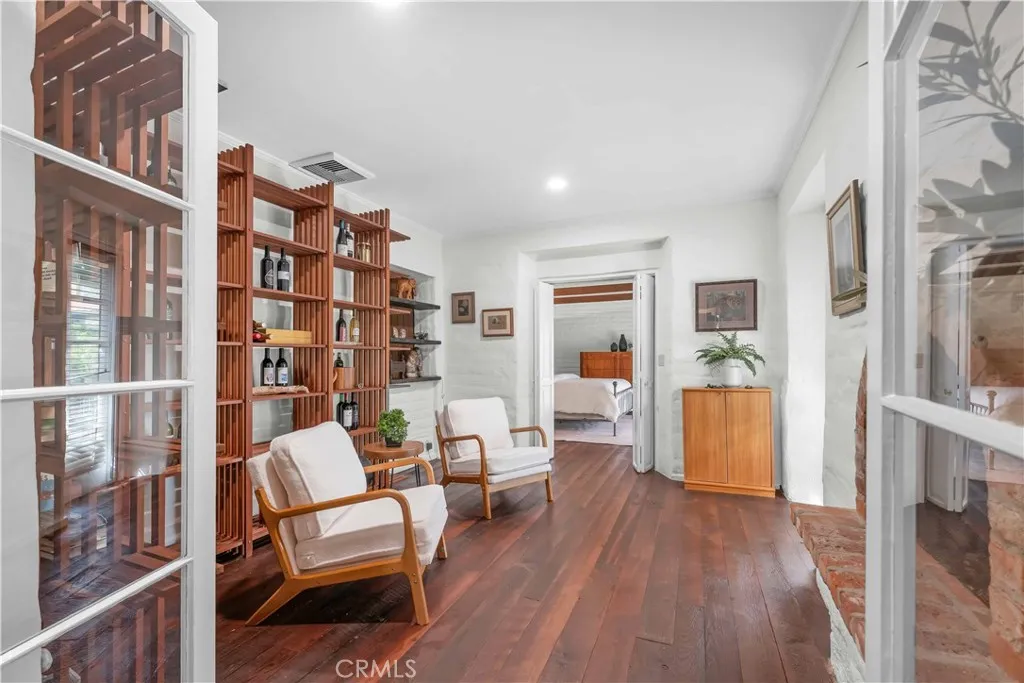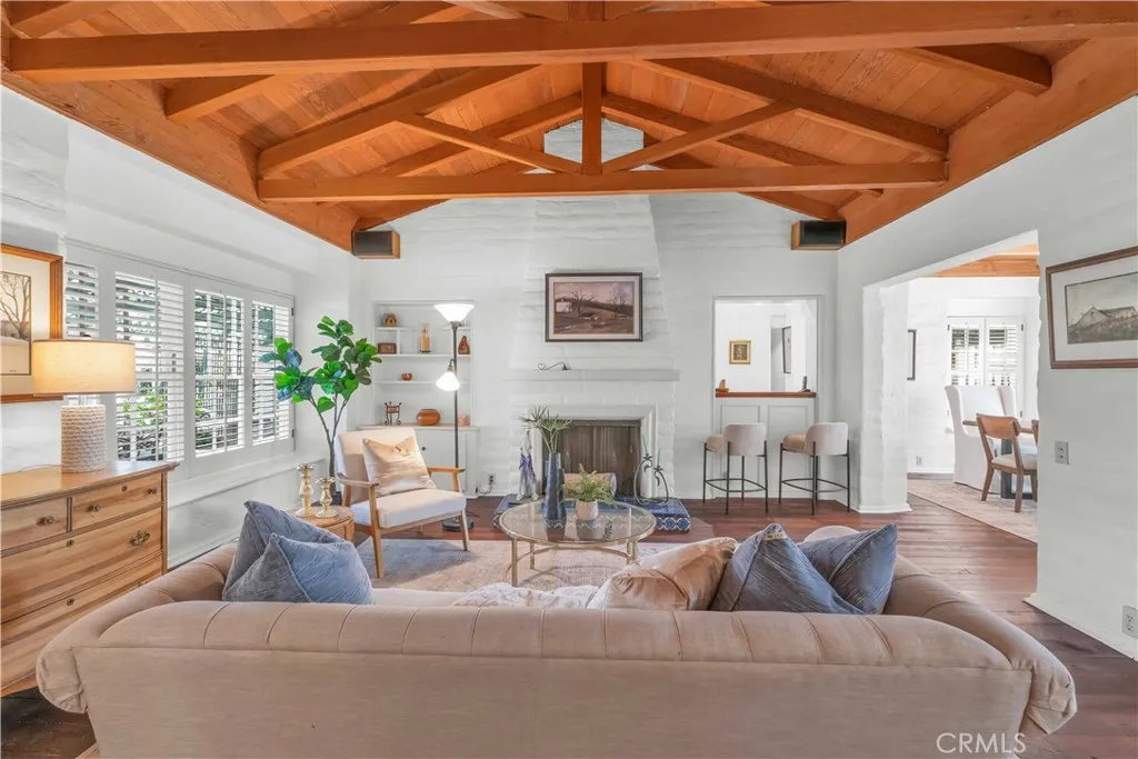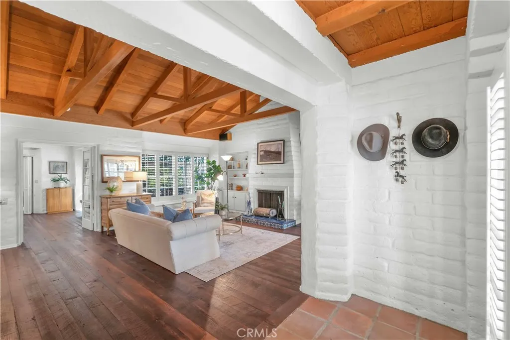Built in the 1940s, this custom adobe residence captures the warmth and character of Old Hollywood charm. Reclaimed wood floors, thick custom adobe walls, and vaulted wood ceilings in the living room, primary suite, and guest ensuite create architectural richness that simply cannot be replicated. Three fireplaces — in the living room, library, and primary retreat — anchor the home with timeless ambiance and dramatic presence.