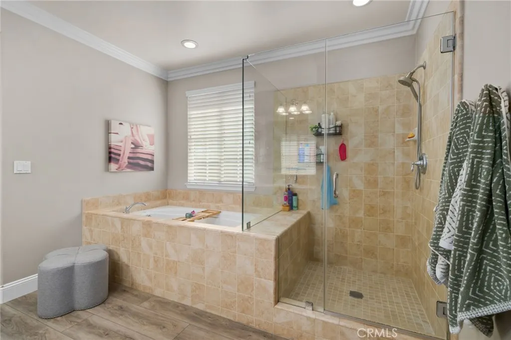 The expansive primary suite is your private retreat, offering direct access to the backyard sanctuary. Enjoy a custom closet system and a spa-like atmosphere that continues outdoors. Designed for relaxation and entertainment alike, the backyard boasts low-maintenance turf, a dog run, vibrant garden beds, and a sparkling pool and spa with cascading waterfalls—all framed by lush, mature landscaping.
