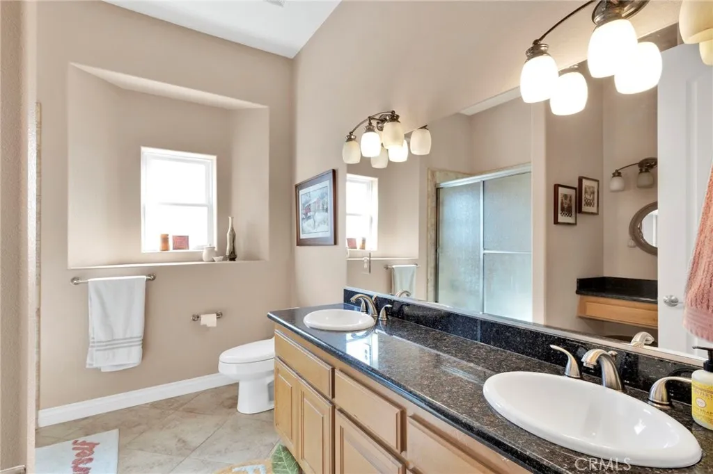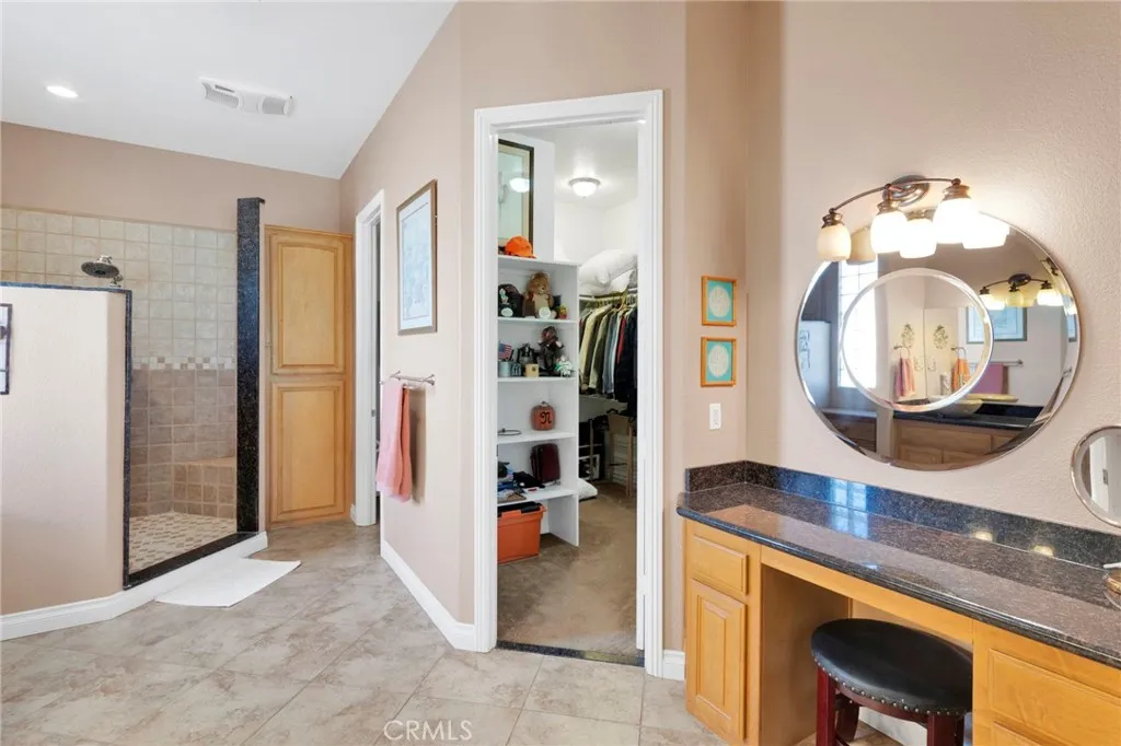 The open-concept living area is bright and spacious, enhanced by custom lighting and ceiling fans throughout, and opens seamlessly to the backyard with stunning views of Hole Five East. The primary bedroom is equally spacious, featuring carpet and a slider leading directly to the backyard. The primary bathroom is a true retreat with upgraded tile floors, granite countertops, dual sinks, a large walk-in shower with dual shower heads, and a separate lighted vanity.