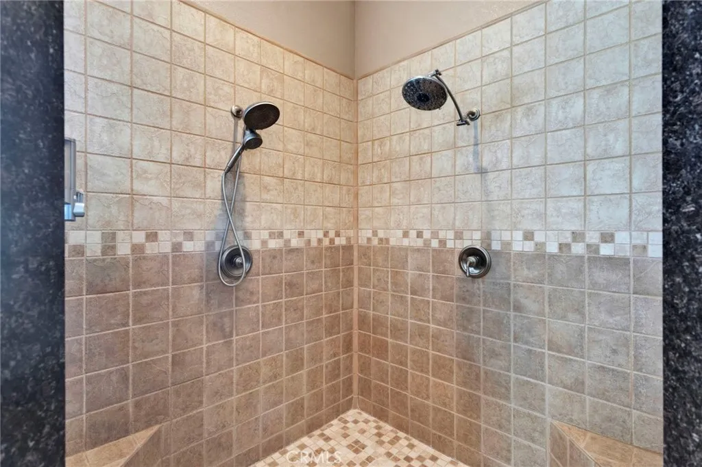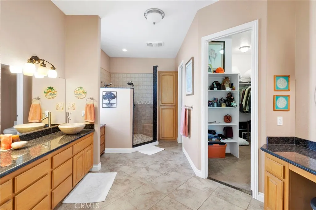 The home offers three bedrooms, including two generously sized guest bedrooms with carpet. The guest bathroom features tile flooring, a tiled shower, and granite dual sinks. Designed for entertaining, the expansive kitchen boasts a large circular granite island with seating for seven, an ice maker, wine fridge, custom backsplash, stainless steel appliances, and a four-burner stove with pot shelves that continue into the living room.
