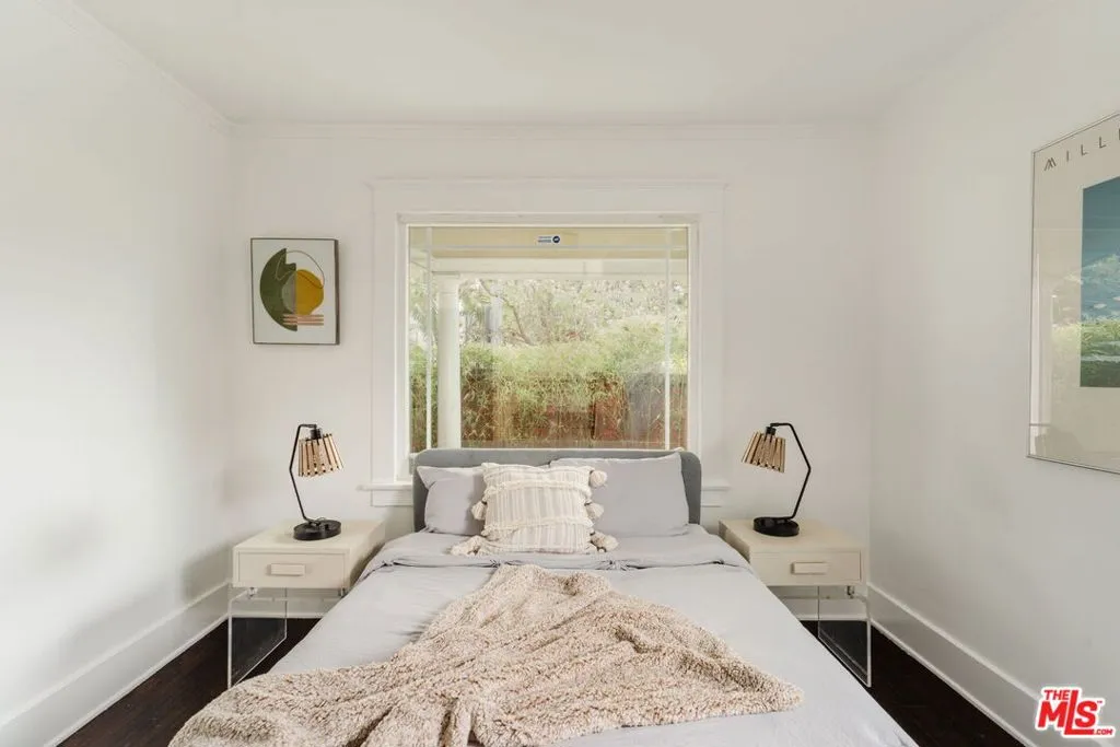 Tucked behind a redwood fence and enveloped by mature bamboo, this enchanting 1921 Craftsman reveals a serene private oasis in the heart of rapidly evolving East Hollywood. Ideally positioned near Hollywood, Silver Lake, and Los Feliz, this two-bedroom, one-bath residence beautifully blends timeless character with thoughtful modern upgrades. A welcoming front porch introduces interiors filled with warmth and light. The spacious living room flows effortlessly into a formal dining room, creating an ideal setting for both relaxed daily living and effortless entertaining. Period charm is complemented by hardwood and tile floors throughout, while solar panels offer meaningful energy efficiency. The stylishly updated kitchen features quartz countertops, generous cabinetry, and stainless steel appliances. Both bedrooms are generously sized with ample closet space and connect via a long central hallway with dual linen closets, along with a refreshed bathroom finished in a clean, modern style. Just beyond the kitchen, the backyard becomes a true extension of the home - an inviting outdoor living and dining retreat perfect for al fresco evenings and weekend gatherings. The detached rear garage includes a washer and dryer and provides valuable additional storage or off-street parking for one car. An exceptional condo alternative, this special property places you in one of the city's most dynamic neighborhoods, moments from beloved dining, nightlife, the Metro and iconic destinations including Hollywood Boulevard, the Griffith Observatory, Barnsdall Park and Sunset Junction.