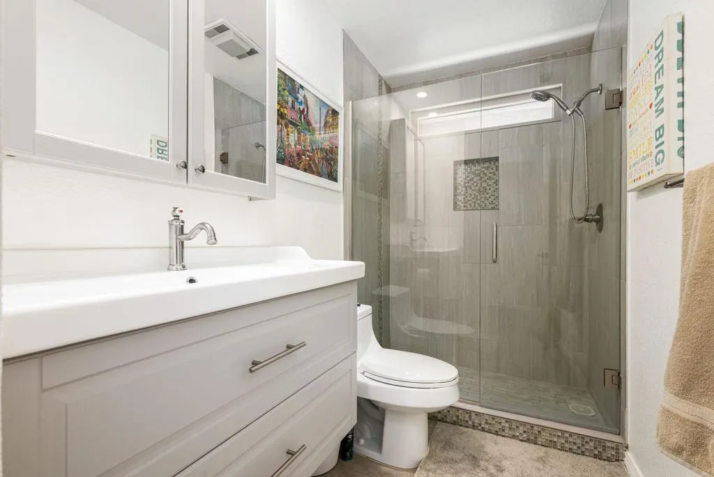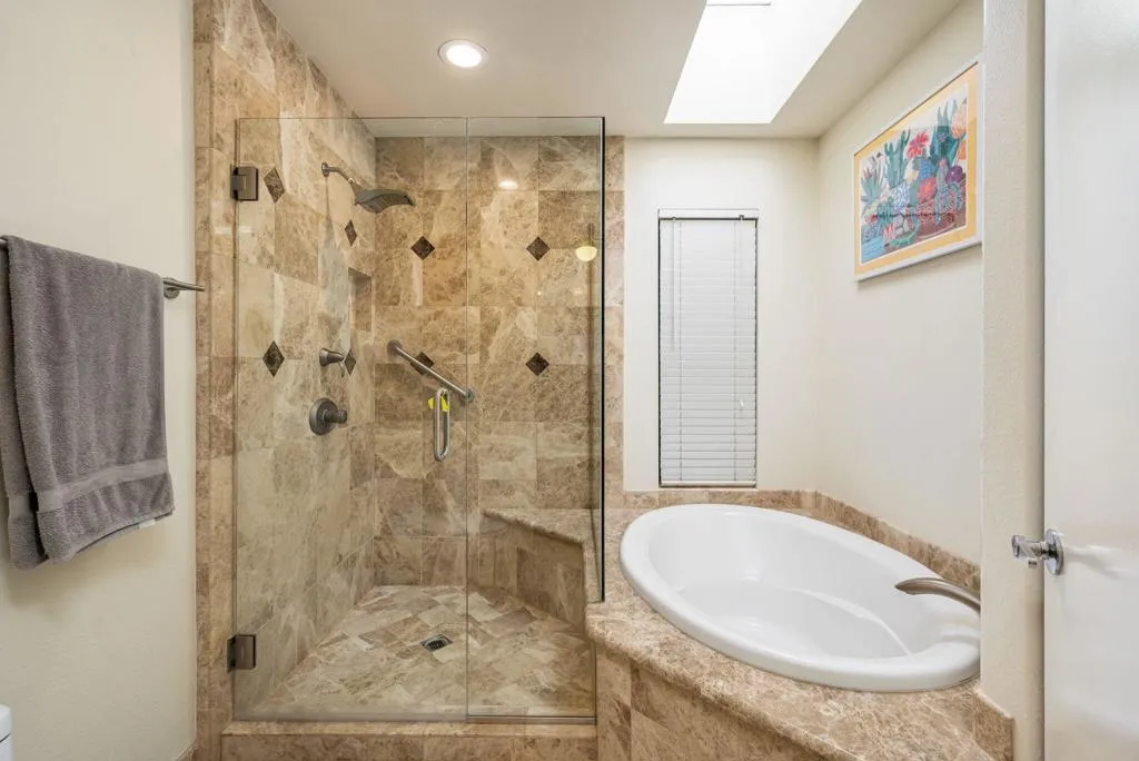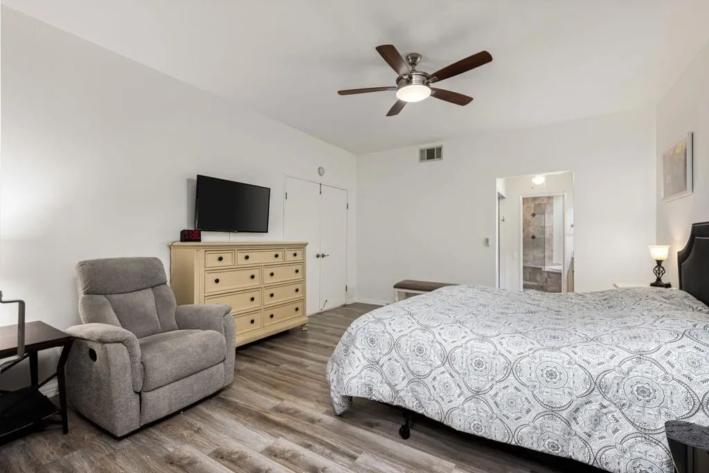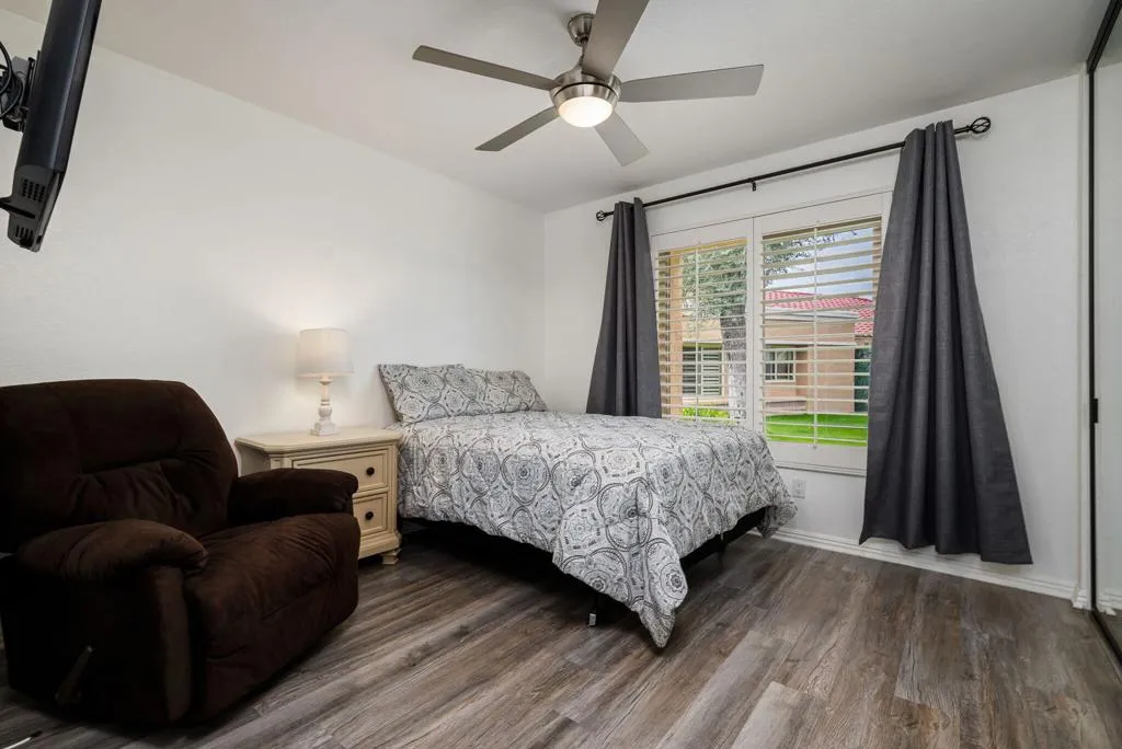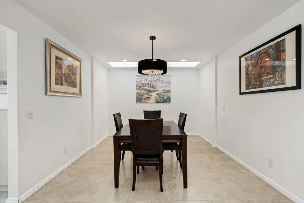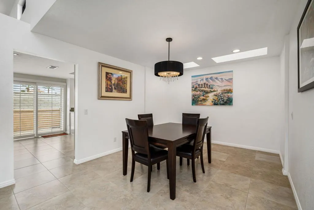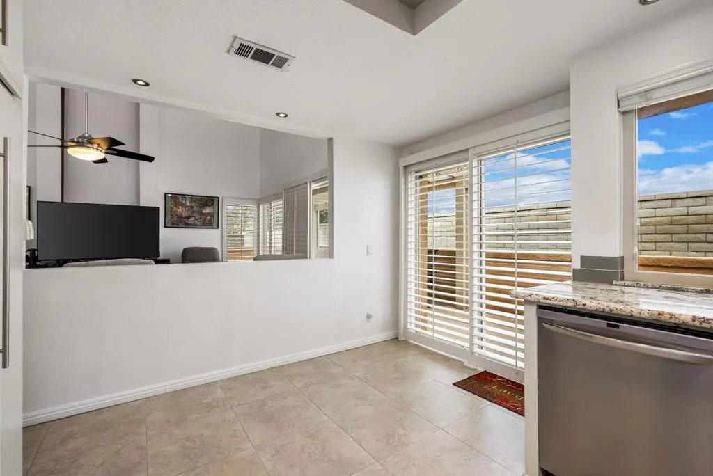 Welcome to Casablanca, tucked away in a beautiful, gated community in a Palm Desert prime location. Walk into a remodeled, modern, light-and-bright living room space. The open floor plan has high ceilings in the living room and entry. It looks into kitchen and dining room with skylights. Remodeled kitchen, and bathrooms, tile floors throughout, newer A/C, newer energy-efficient windows, and a fabulous bonus space. Main bathroom and guest bathroom have all newer cabinets and counters and custom tile work in the showers. Main bedroom suite has bonus space for a small office, with barn doors, and a skylight. The garage floor boasts epoxy flooring, new garage door opener, and an additional storage area. The location is one of the best, end of a quiet cul-de-sac next to a greenbelt with a peek-a-boo mountain view. HOA fees include premium cable, common area maintenance, roof, trash, tennis, pickleball, and four swimming pools and spas. Enjoy world-class amenities close by, including golf, tennis, pickleball, hiking, biking, the McCallum Theatre, and the renowned Arcisure Arena. Thirty-day vacation rental minimum. Two dog limit.
