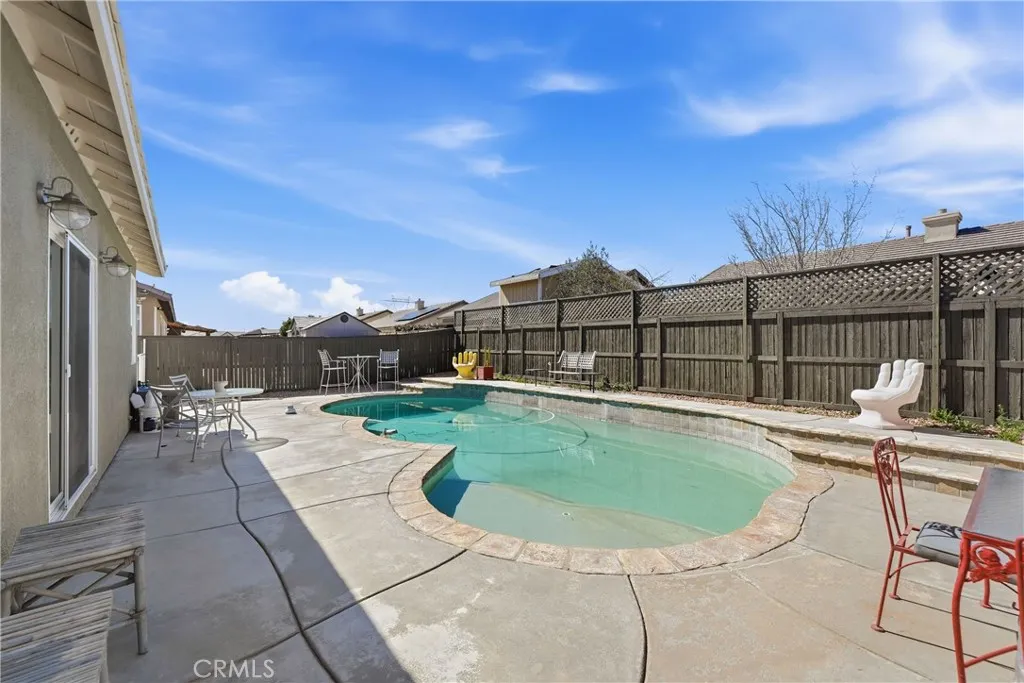 Out back, enjoy your own backyard oasis with a sparkling pool—perfect for relaxing weekends or summer get-togethers. A covered patio provides shade and comfort, making outdoor living enjoyable year-round.