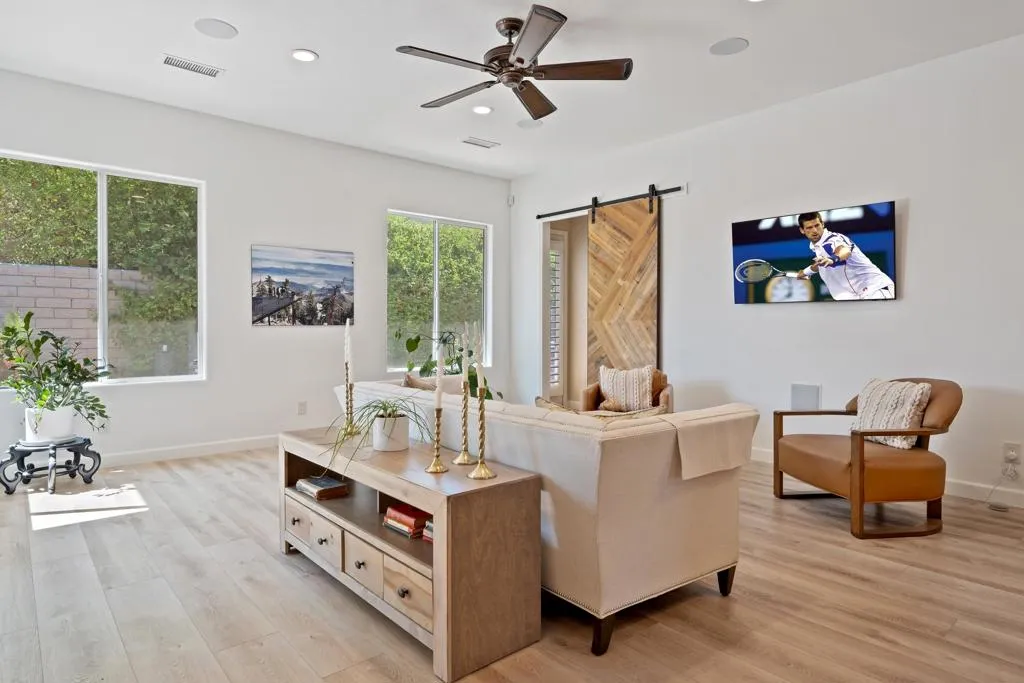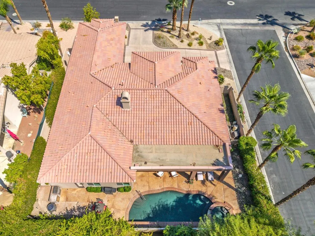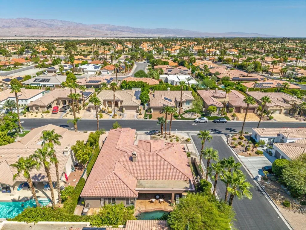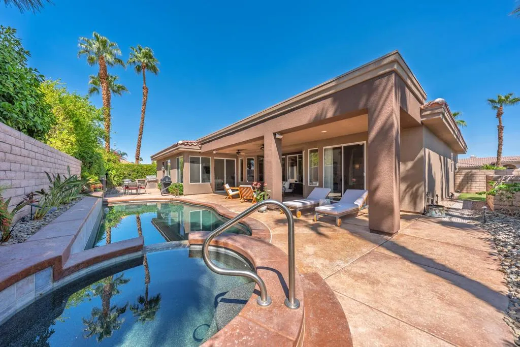 Stunning custom Tom Noble home located in the highly desirable and rarely available Montecito community of Palm Desert, California. Set on an elevated interior corner lot with a circular driveway, this beautifully upgraded residence offers 4 bedrooms plus a private office and 4 bathrooms, providing the ideal layout for full-time living or a luxury desert retreat.Inside, enjoy 4 cooling zones (5 thermostats) with newer AC units, LED lighting, solid-core doors, Hunter Douglas ceiling fans, surround sound, fresh interior paint, and luxury vinyl plank flooring throughout.The chef's kitchen is designed for both cooking and entertaining, featuring stainless steel appliances, a Dacor 6-burner gas cooktop, granite countertops, pull-out drawers, two pantries (including one with a glass-panel door), a Franke graphite sink, gooseneck faucet, backsplash detail, and custom crown molding with elegant up-lighting.The spacious primary suite includes two walk-in closets with pull-down rods and an additional linen closet, offering exceptional storage and convenience.The epoxied 3-car garage features built-in custom cabinetry for organized storage.Outdoor living shines with newly remodeled front and rear landscaping, upgraded lighting, new sprinklers, and drought-tolerant plantings. The private backyard is a true desert oasis with a Pebble-Tec pool and spa and a built-in BBQ island with a refrigerator--perfect for year-round entertaining in Palm Desert's resort-style climate.This exceptional home in Montecito, Palm Desert combines quality construction, refined upgrades, and an unbeatable location near world-class golf, dining, and shopping.