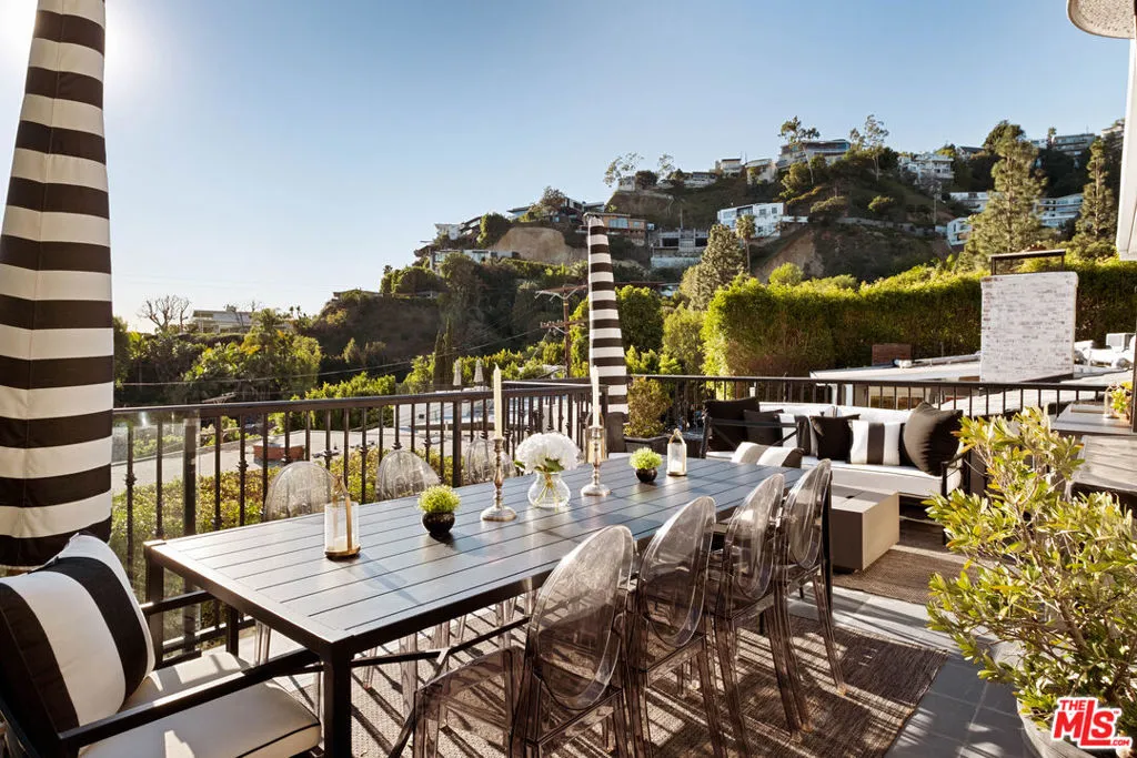 A meticulously renovated jewel box on one of the Hollywood Hills' most coveted streets, offering sweeping ocean and Catalina views, exceptional privacy, and designer finishes throughout. The open living and dining areas, anchored by a statement fireplace, flow into a beautifully appointed kitchen with Carrara marble island, custom cabinetry, plus wine and beverage refrigerators. Seamless indoor-outdoor living unfolds across multiple terraces featuring a built-in BBQ, hydrotherapy spa, outdoor lounge areas, and spaces ideal for entertaining or relaxing. The home includes a tranquil guest suite with en-suite bath, an additional bedroom or den with elegant detailing, and a stunning primary suite occupying the entire upper level. This private sanctuary features dramatic cathedral ceilings, abundant natural light, walk-in closet, spa-inspired bath, and a private terrace with wet bar, fire pit, and panoramic views from downtown to the ocean. Complete with a spotless two-car garage, extra storage, and included outdoor furnishings, this move-in-ready residence embodies refined, effortless Hollywood Hills living just moments from the Chateau Marmont and Sunset Strip.