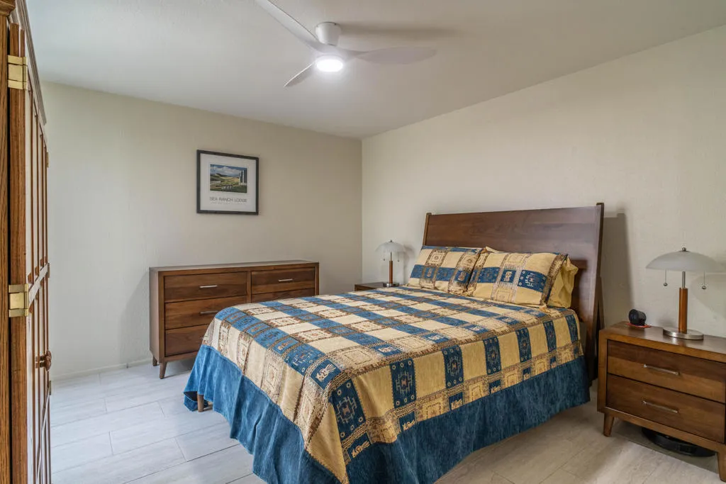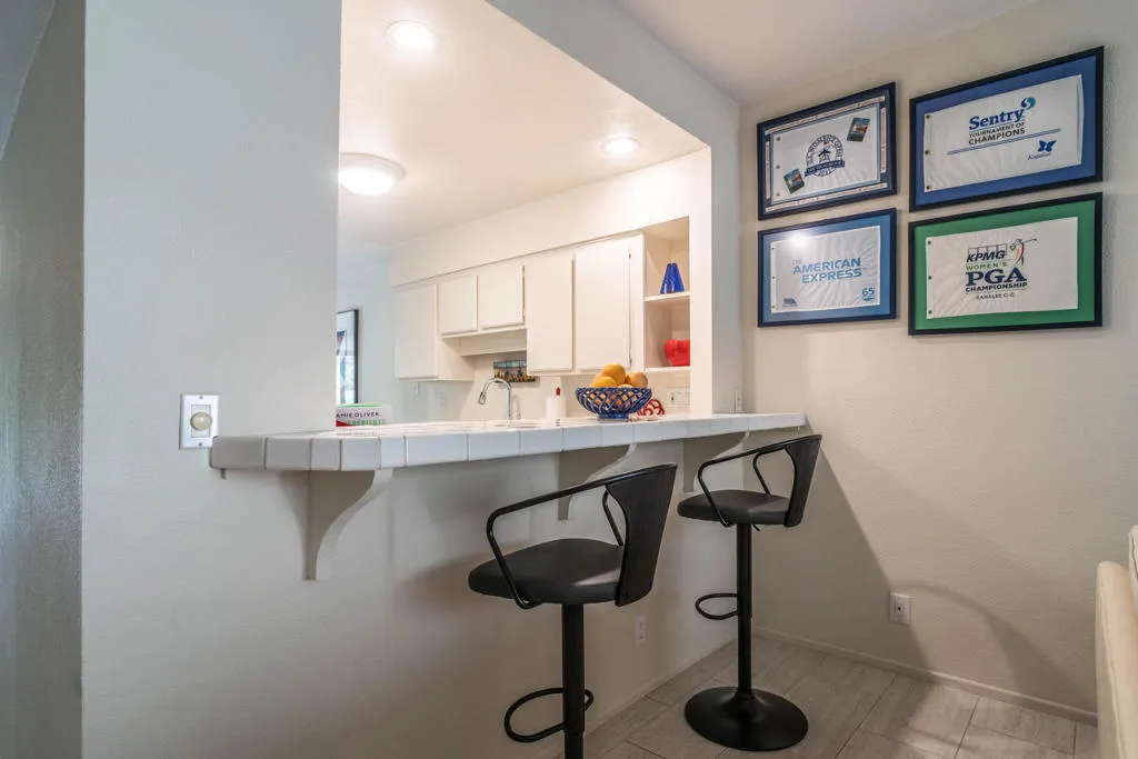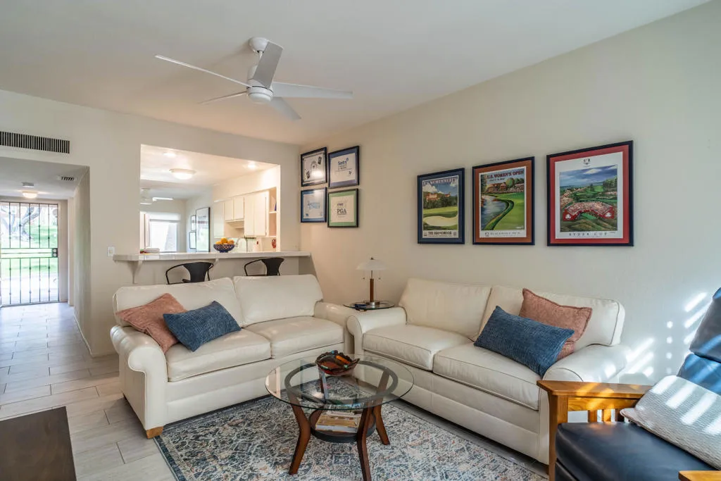 Discover your quiet desert getaway inside the gated community of Corsican Villas in the heart of South Palm Desert. This single-story, 2-bedroom, 2-bathroom condo features a light and airy floor plan accented by newer wood-look tile flooring in a versatile neutral palette. The kitchen offers a sunny dining nook plus a breakfast bar that opens seamlessly into the living area. Relax in comfort in the primary suite, which includes a double-sink vanity, walk-in shower, and walk-in closet. Corsican Villas HOA fee covers water, cable/internet, roof maintenance, exterior paint/stucco, and grounds upkeep plus premium amenities, including four pools and spas, tennis/pickleball courts and a small putting green. Perfectly located across from The Living Desert and just minutes from the world-class shopping and dining on El Paseo.
